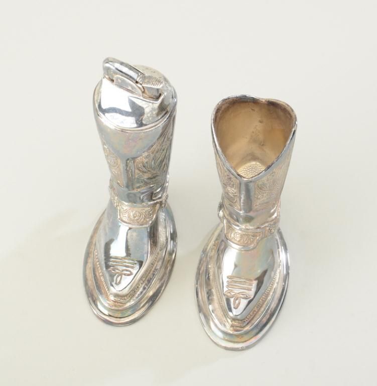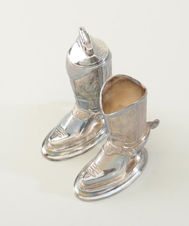 Silver plated cast metal cigarette set in the shape of fancy cowboy boots including one boot as a cigarette holder, the other boot is the lighter, appears circa 1940’s-50’s; a fine decorator for the Western theme or gunroom. Est.: $50-$75.