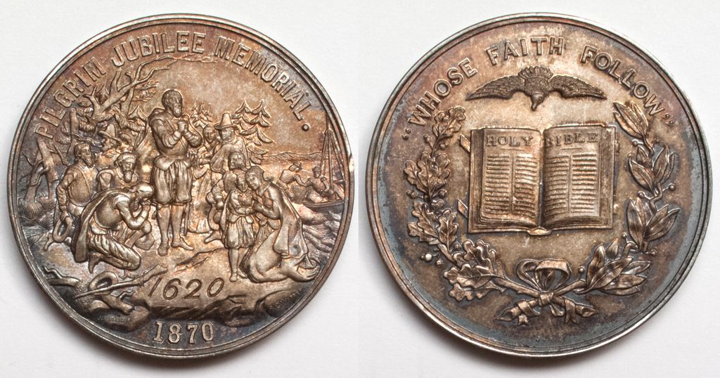 Pilgrim Jubilee Memorial 1620-1870 Picture is of a group of Pilgrims praying. Reverse picture is an open bible with a dove above and "Whose Faith Follow." This is a nice original piece with underlying luster. AY-BU. R-5. HK 13.City: County: State: Date:
