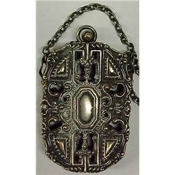 Silver plated vinaigrette on chain, 2 3/4" long case with hinged opening in middle, pierced open work and engraving on sides, 9" chain