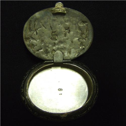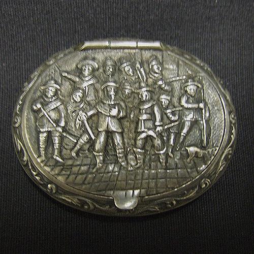 Silver snuff box; C. 1890 oval shaped box with scene; 2 1/8" by 1 3/4" and 1/2" deep; hinged lid opens from top; marked inside M+ C with hallmark; tests 800 silver (no visible defects)