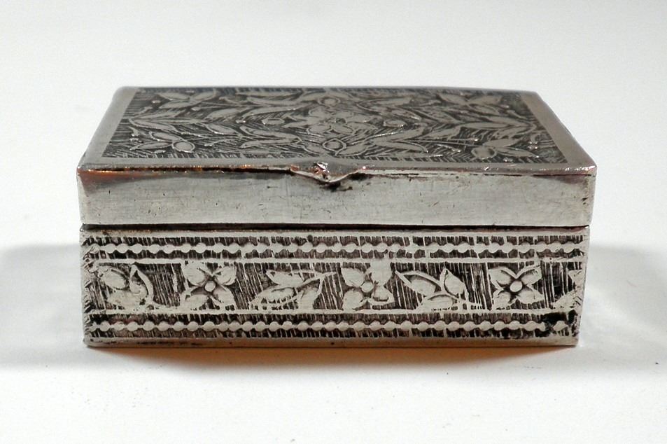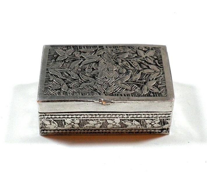 Silver tobacco box with leaf carvings, signed, weight: 24.2 gm, dimensions: 4.5X2.5X1.5 cm.