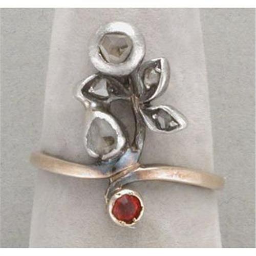 Pretty silver-topped gold (14K, remnants of hallmarks are unreadable, but tested) ring set with rudimentarily-cut diamonds. The small ones measure approximately 3MM x 1.6MM, 3.2MM in diameter on the large "roundish" one; and 3.3MM x 2.9MM on the pear-shaped diamond. The red stone measures approximately 2.4MM in diameter. Top of the ring measures approximately 9.7 MM in width and 20MM in length. It is a size 7 and weighs 3.6 grams. For the purists--intact patina!