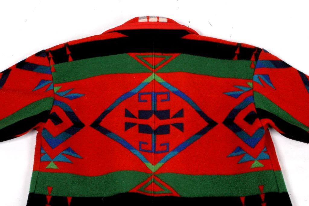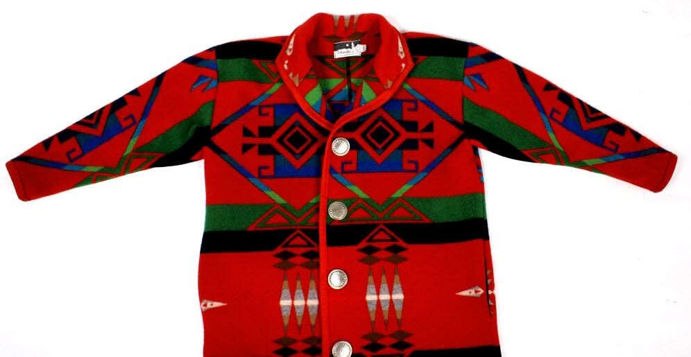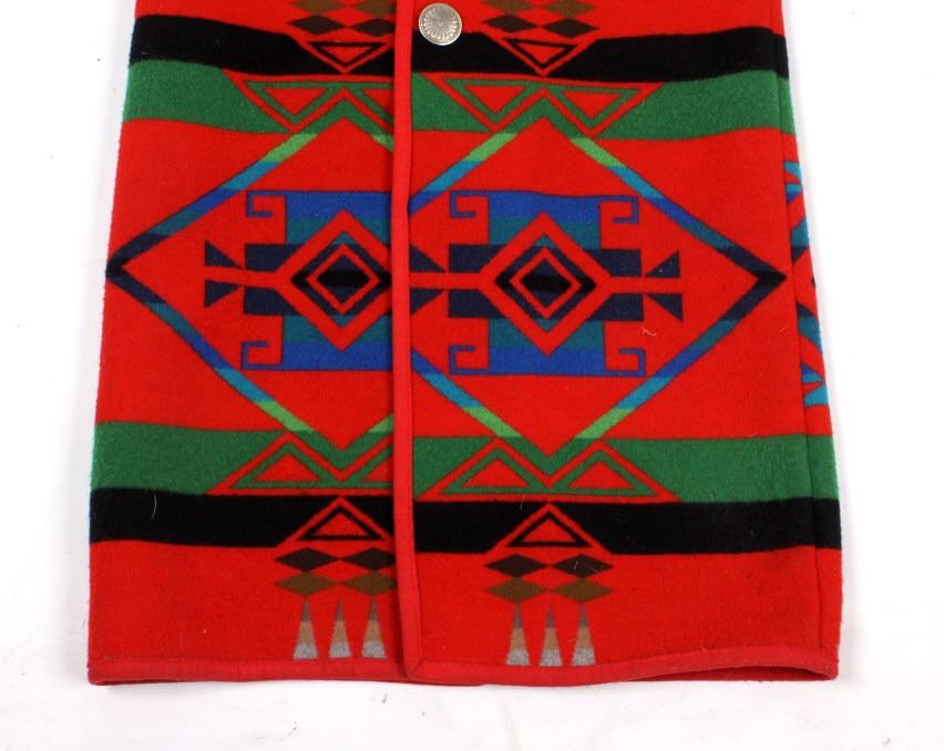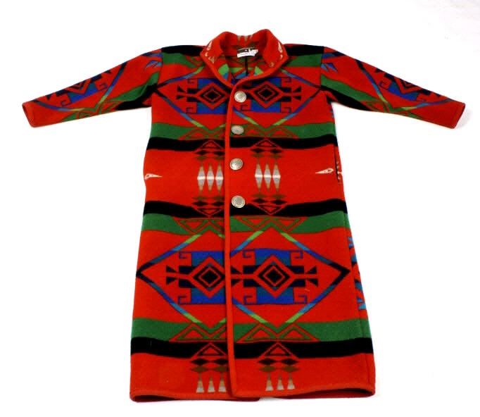 The lot features an absolutely gorgeous Silverado long dress coat made from a Pendleton Chief Joseph Pattern blanket. The jacket / coat shows an iconic Western Native American Indian inspired pattern and styling. The coat also shows various silver like round tooled style concho buttons. The buttons show a diamond pattern centered in a sun decoration with a twisted rope border bordered by a slick band. The decoration shows a Native American tribal stylized like many Navajo rugs showing a collection of different colors including blood red, navy blue, teal, forest green, lime green, black light brown, and forest floor brown. The measurements of this jacket is small, and is 50" collar to split coat tail.