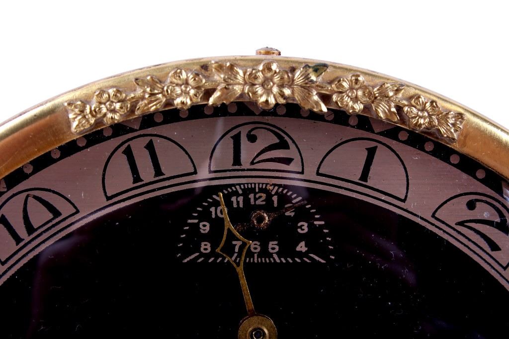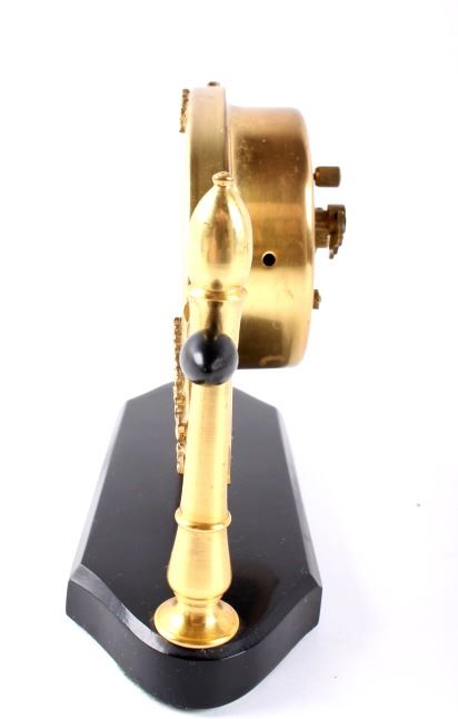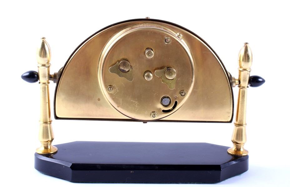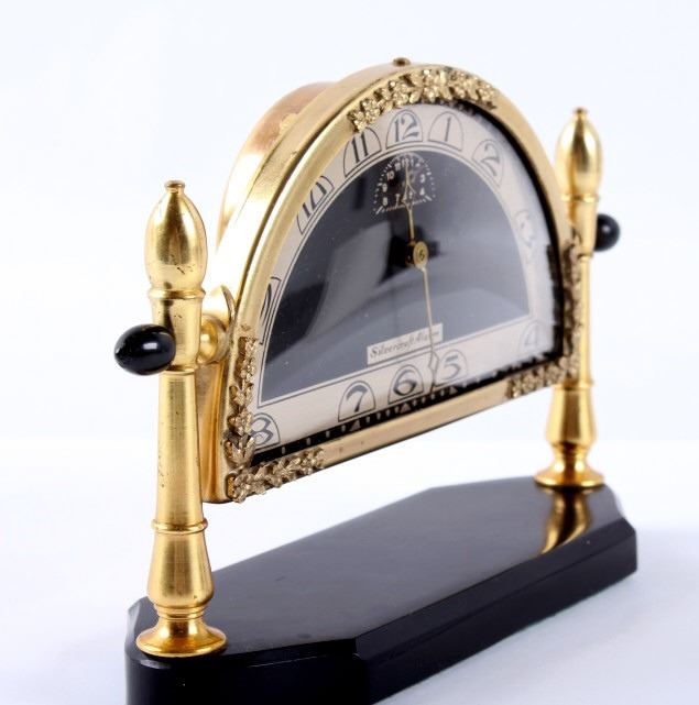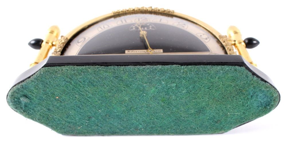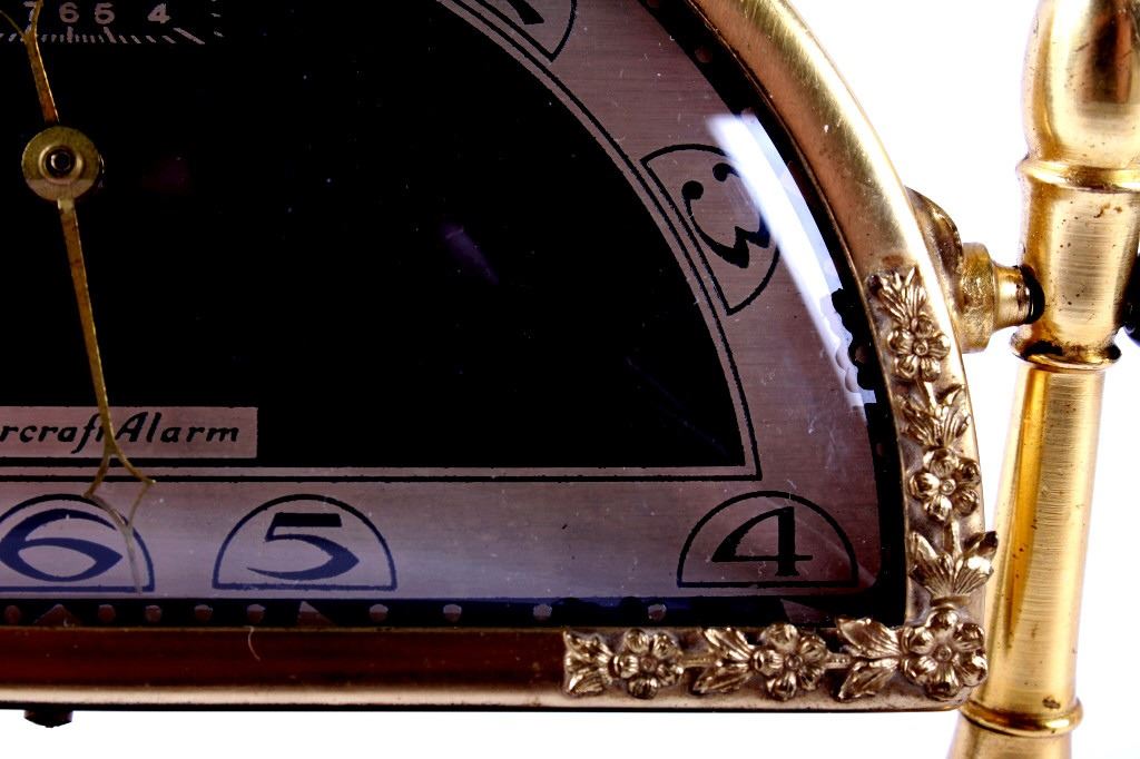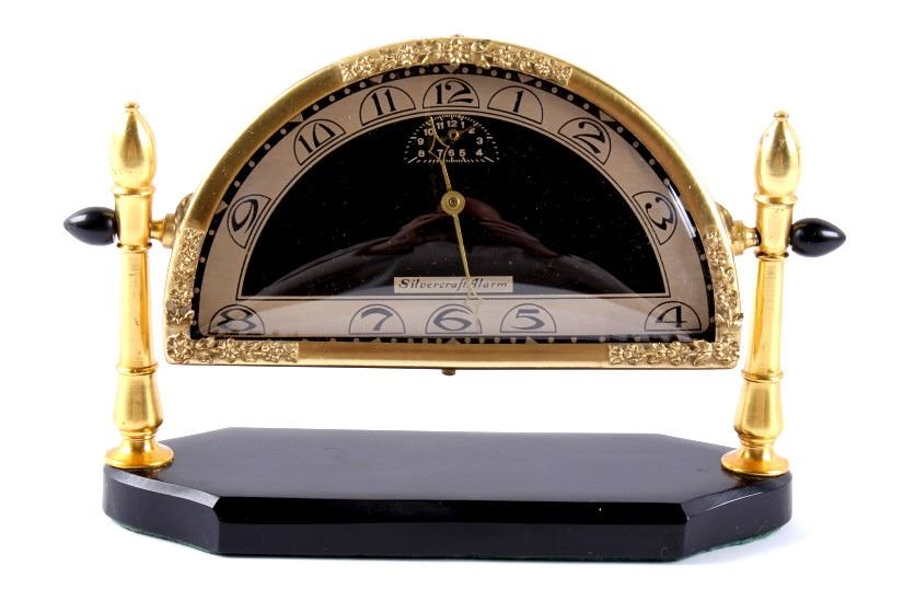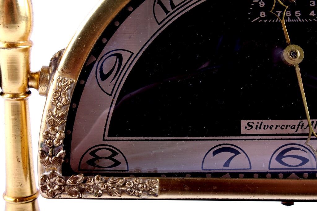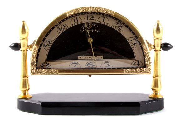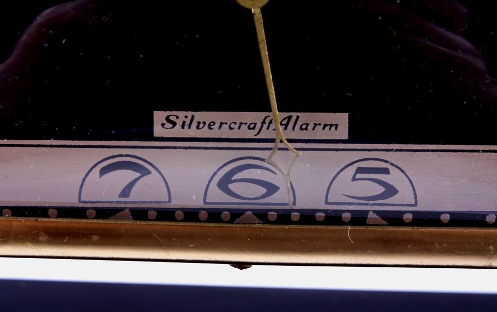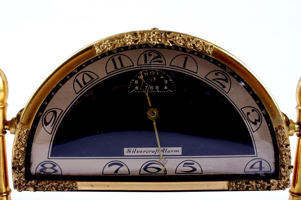 You are bidding on an antique Silvercraft Alarm swiveling alarm clock. The clock is solid brass with a convex glass bezel and has a half moon shaped black and gold face. This wind up alarm clock works and keeps time and is a very attractive period piece. It measures 6.75" x 2" x 4.5".
