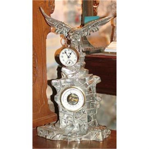 Beautiful antique Inkstand , silvered , an eagle holding the clock and a barometer in good operative conditions, the Clock is working properly and features an important magnifier glass, the Barometer indicates weather (Spanish). The piece stands 17 inches tall and 10 inches wide (the eagle wings).