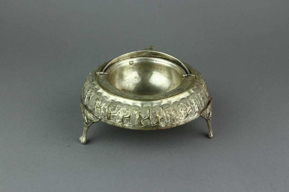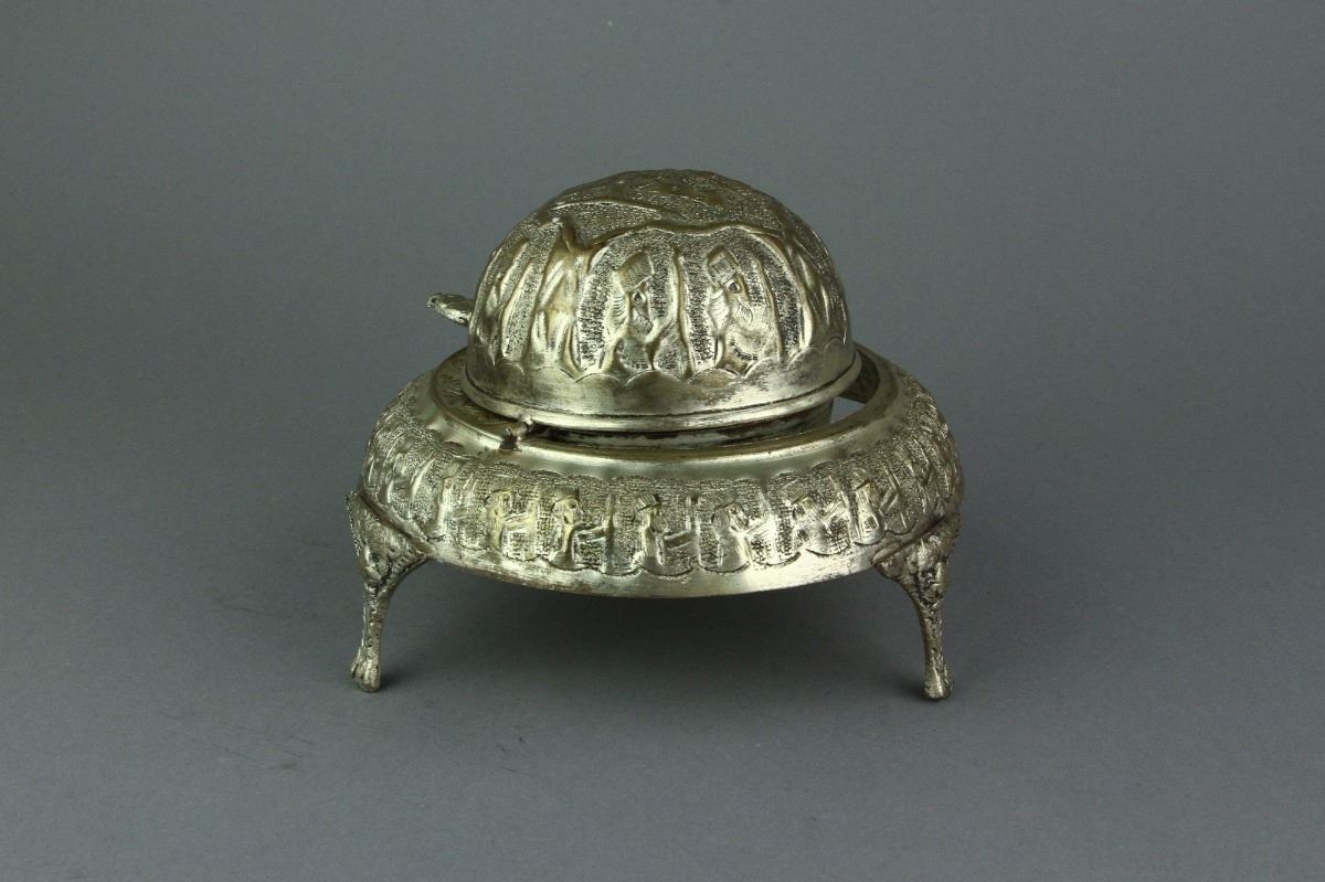 Silvered censer; comprised of domed cover and tripod stand; featuring primitive designs in low relief; H: 10 cm, D: 16 cm, 260 grams