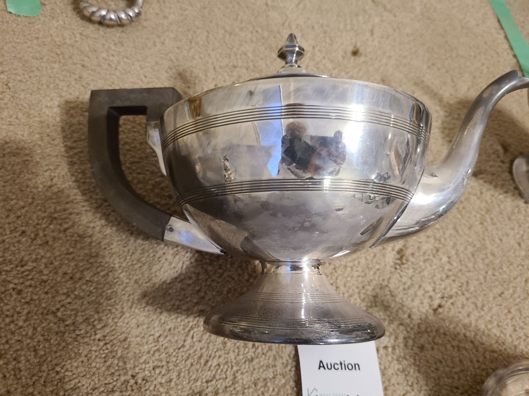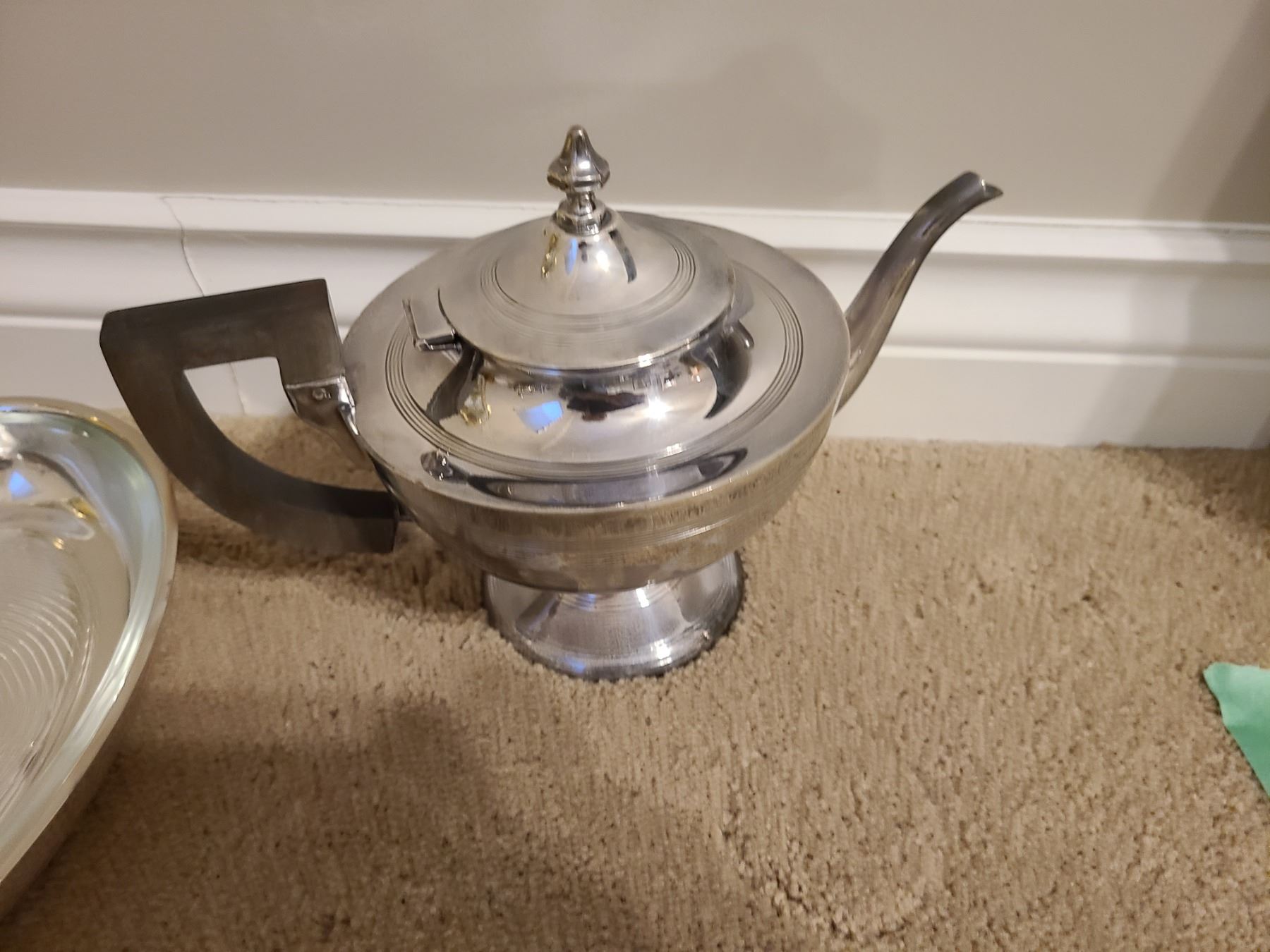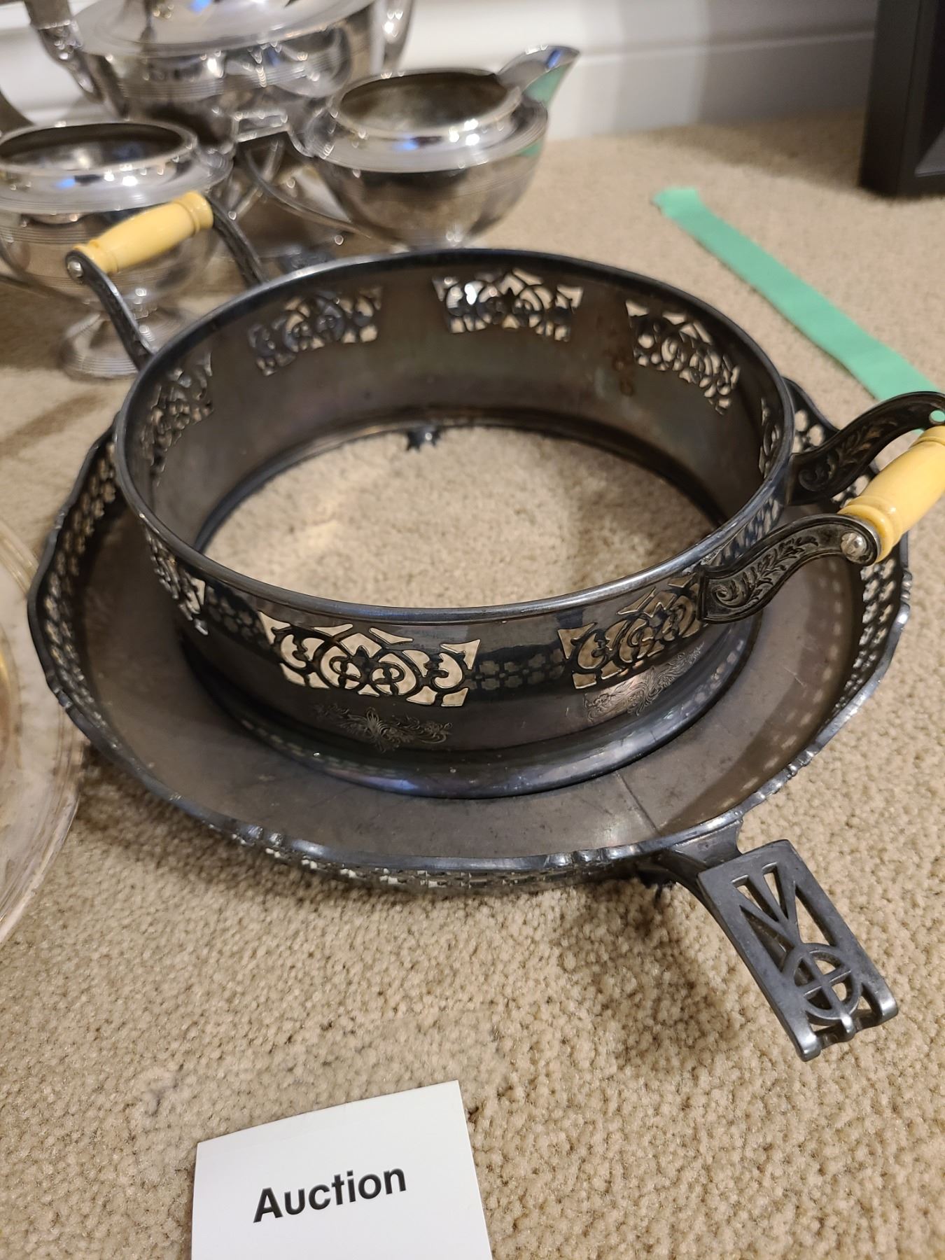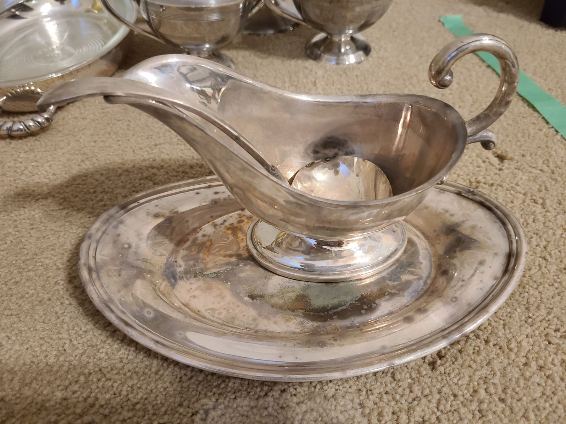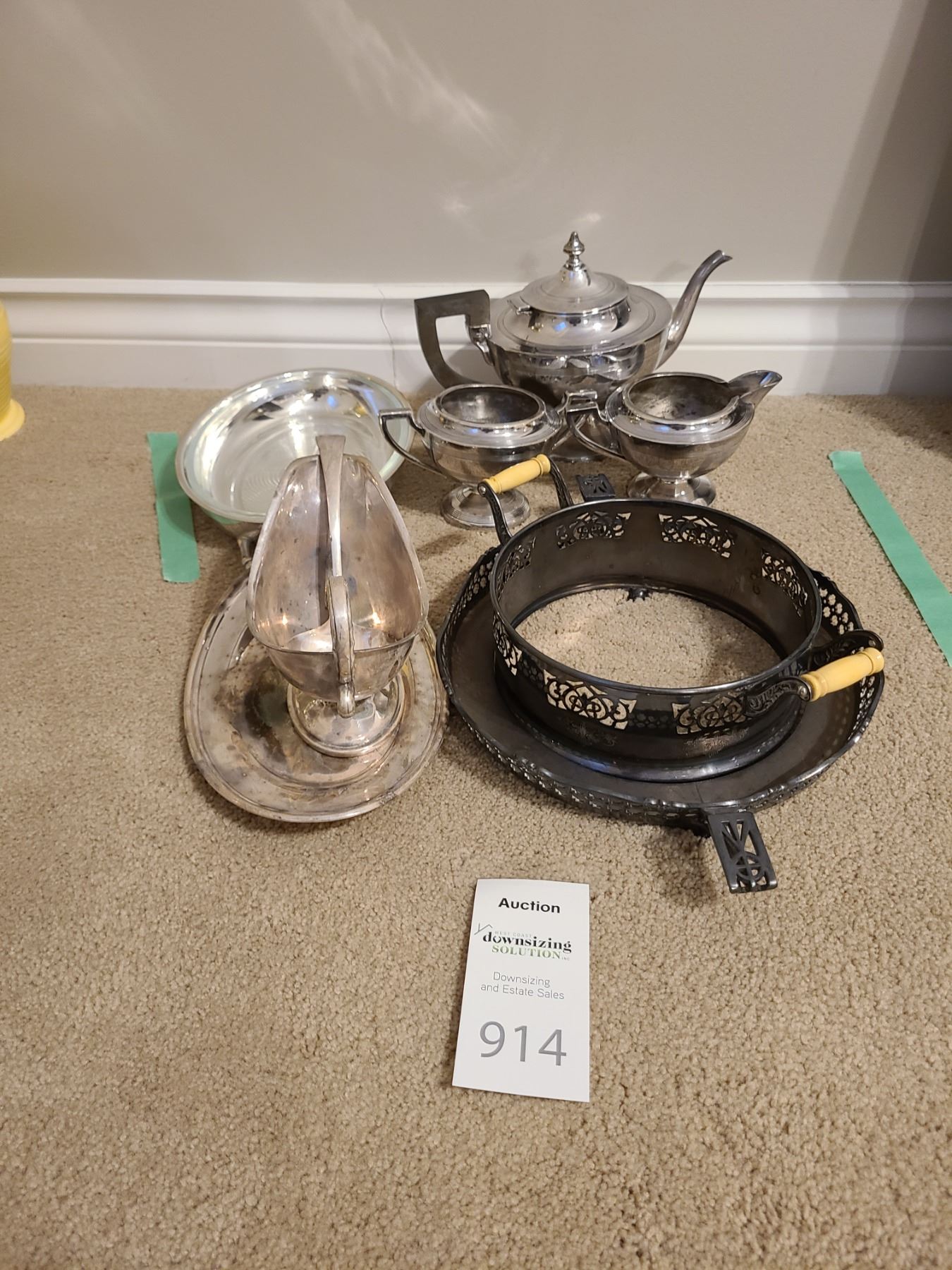 Silverplate includes gravy bowl, platters, teapot, sugar, and creamer. Pickup 9 am.