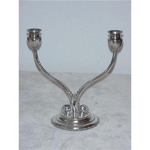 A silver on copper two branch candleholder, 10" tall, 9 3/4" wide, 5" diameter base, reminicent of George Jensen in style this one was made by Apollo E.P.N.S. And given the name "King Eric". A good looking candleholder for your dinning table or sideboard. Condition is good the silver shows rements of having been lacquered but now the lacquer is mostly gone and it polishes beautifully. There is some corrosion on the underside of the piece but does not effect the overall condition. (2)
