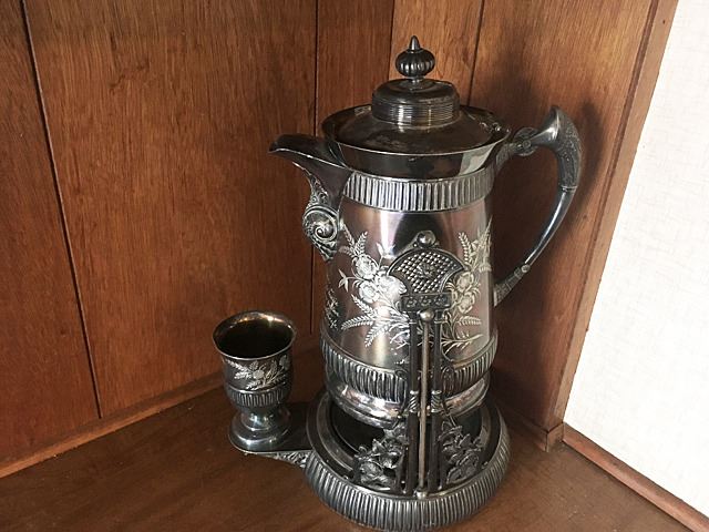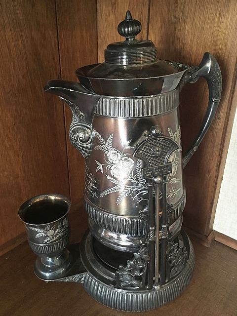 Very ornate silverplate vintage coffee pot/server, highly etched and decorative with drip catcher cup.