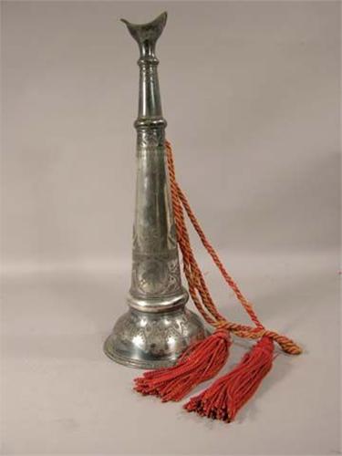 Presentation grade silverplate fire trumpet. No inscription, highly engraved, helmet/hose/ladder, 19" long, Ex. cond.