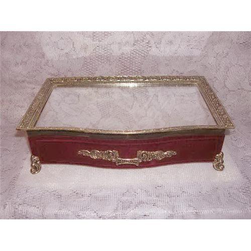 Rich red velour single drawer jewelry box topped with a mirror with detailed edging and fancy scroll handle and feet. The velour is in like-new condition other than a tiny wear mark on the bottom side and a rub mark on the inside lip of the drawer from being opened and shut. Both spots are out of view. The mirror and scroll handle and feet are perfect. Inside also clean and very good. I charge only actual S&H. Offers accepted.