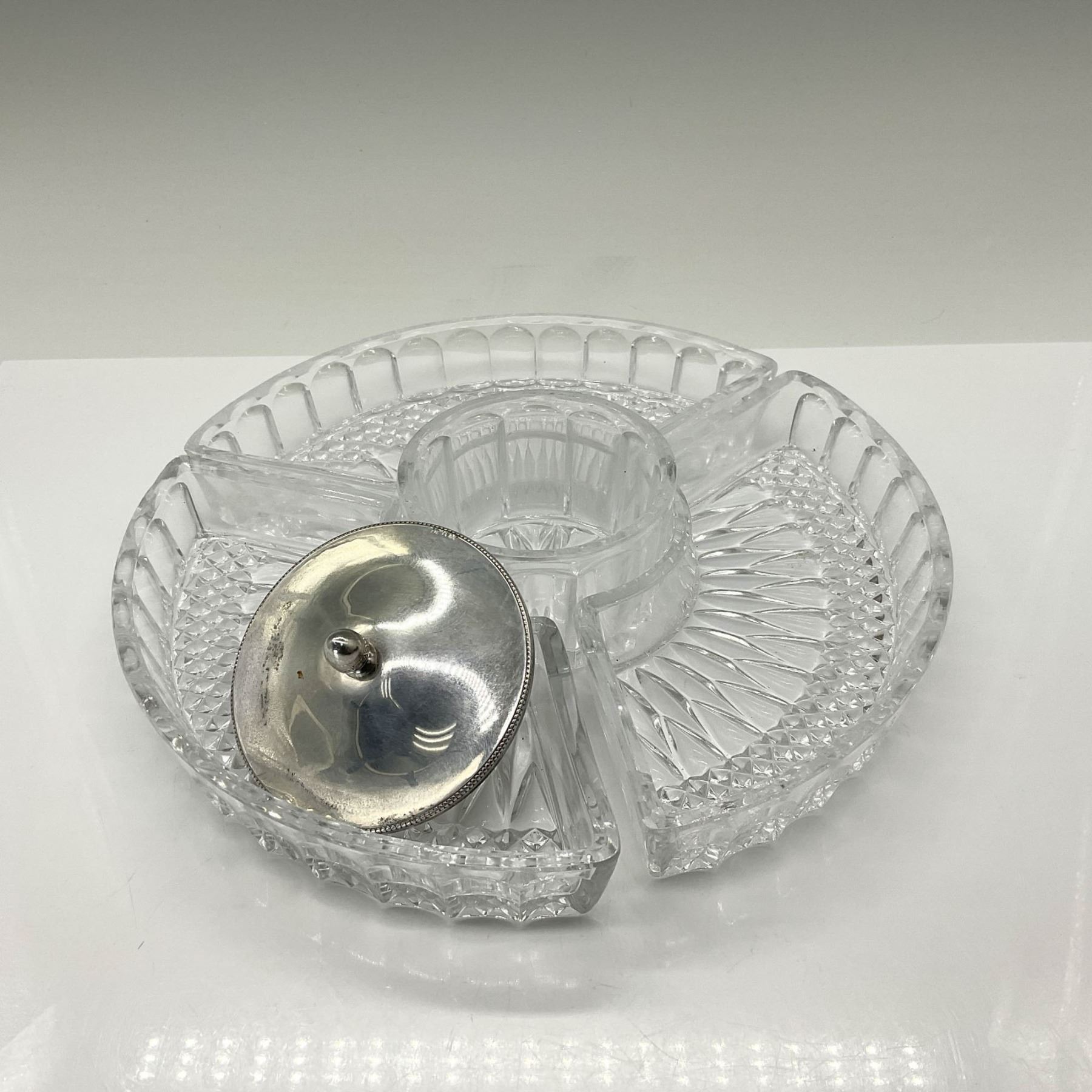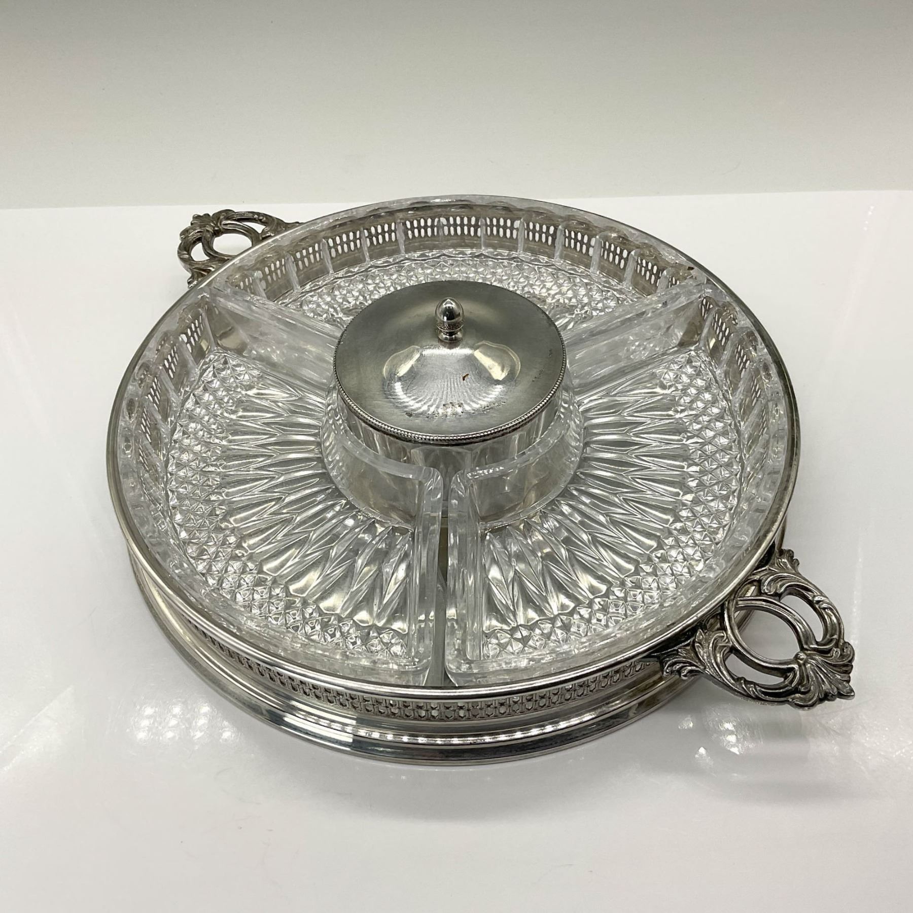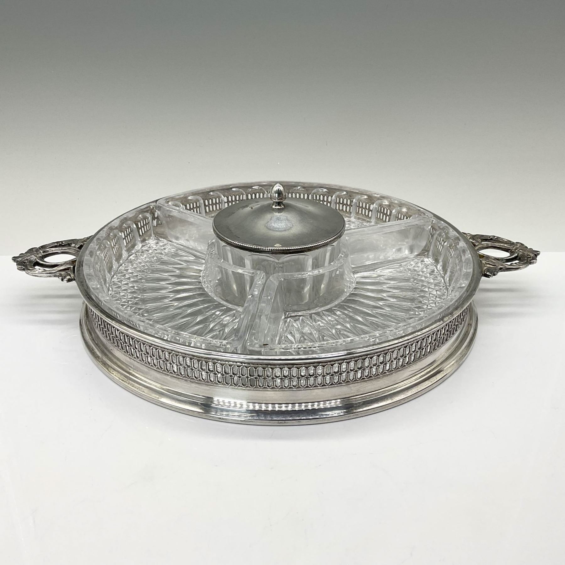 This beautiful silverplated tray features a reticulated edge and double handles, adding a touch of elegance to any table. It includes three patterned glass inserts and a lidded center dip bowl, perfect for serving a variety of treats. Marked under the handles with a crowned maker's mark and Italy.
