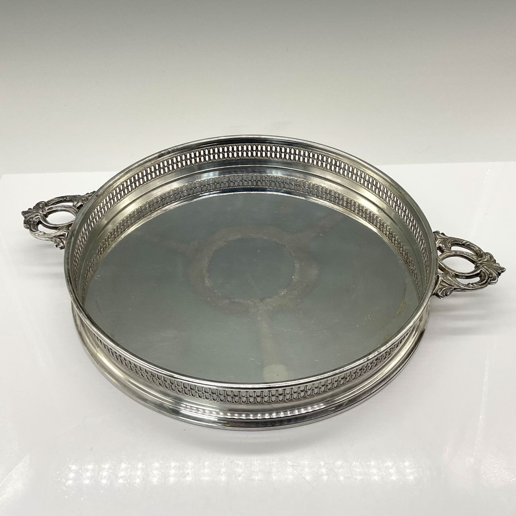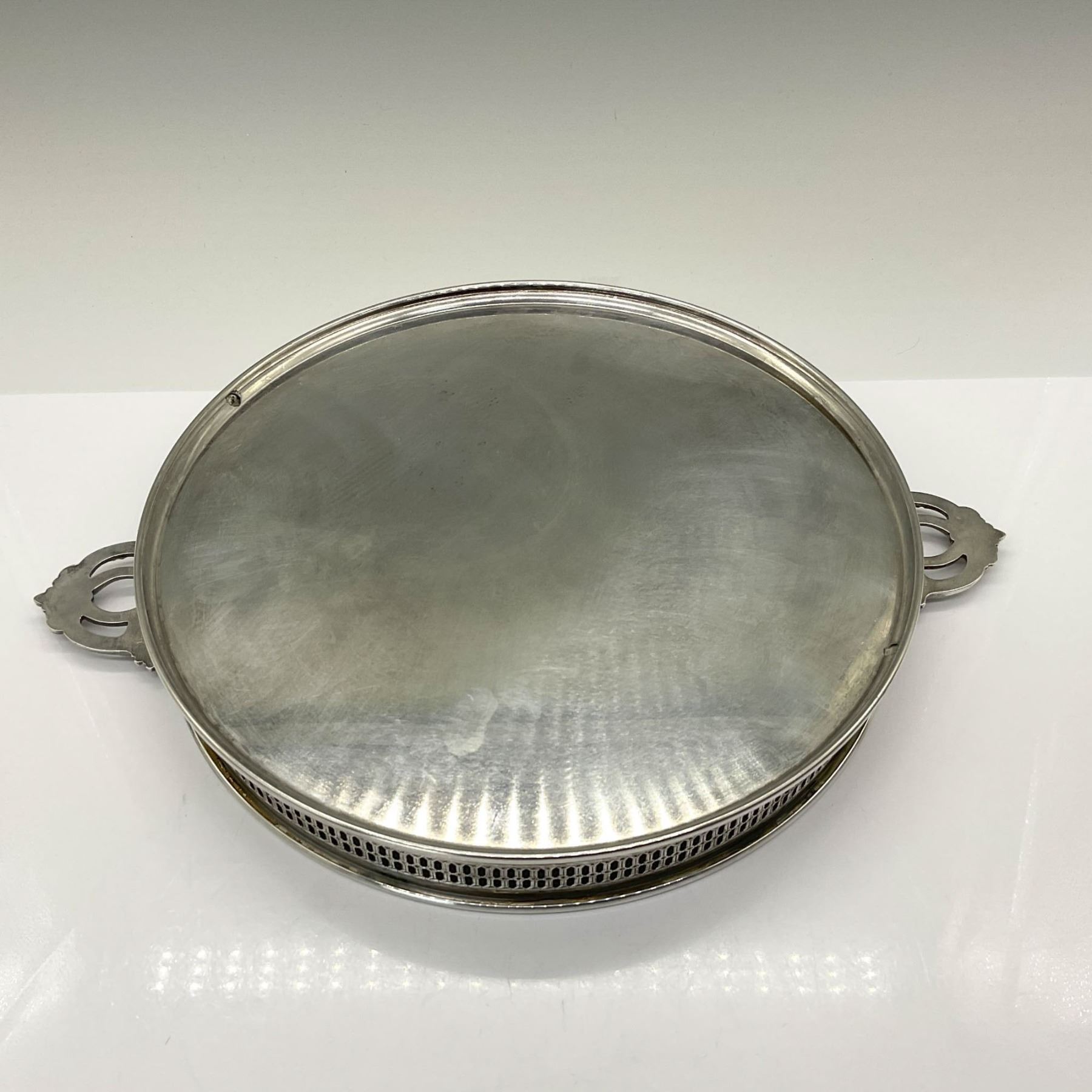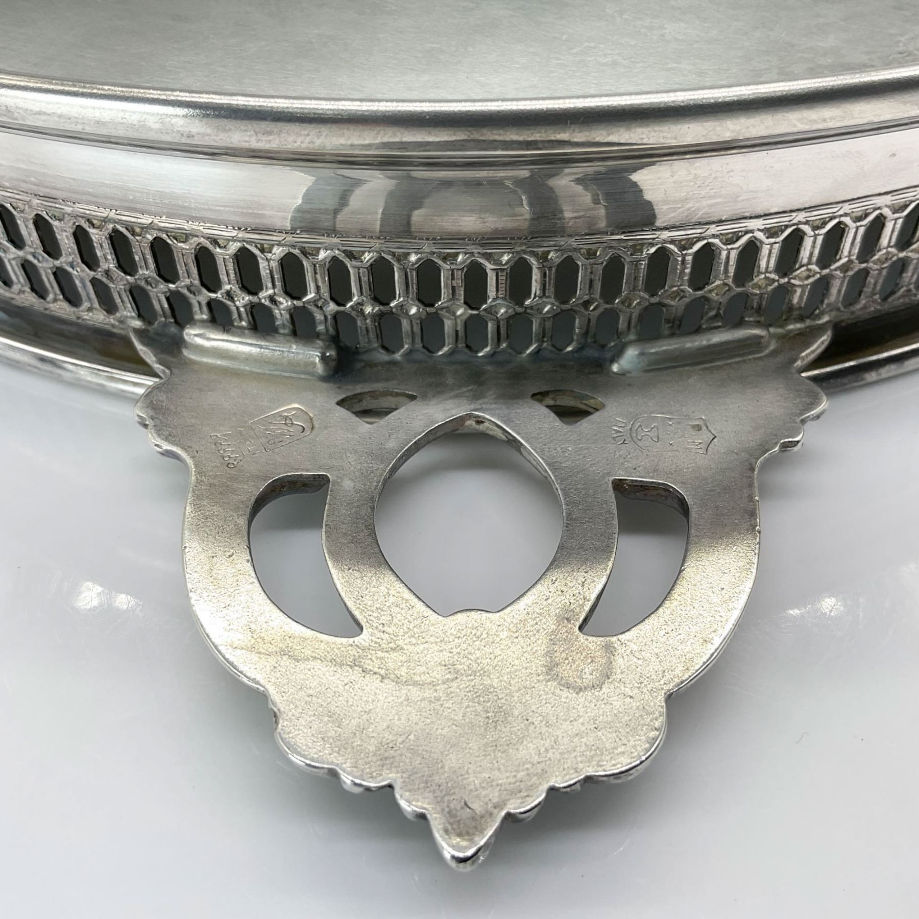 This beautiful silverplated tray features a reticulated edge and double handles, adding a touch of elegance to any table. It includes three patterned glass inserts and a lidded center dip bowl, perfect for serving a variety of treats. Marked under the handles with a crowned maker's mark and Italy.