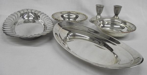 From the Proctor Collection we have Silver plate Trays & Sterling Candlesticks, largest tray measures 13.5"L x 7.25"W and bowl is 3.5"H x 11"L x 7.5"W, #1 candlesticks are marked sterling weighted #2 small silver plate bowl, unmarked #3 small bowl hallmarked "trademark 1883 Roger's Silver Co. Silver on Copper 1028" #4 oval tray marked Reed & Barton 214 #5 oval tray marked "Waverly Wm Rogers 3819, ornate scalloped edges