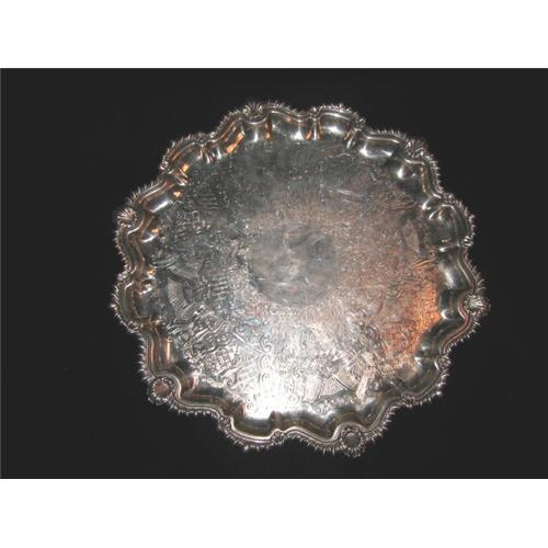 You are viewing a Silverplate Waiter Tray used for formally offering food, drinks, letters or visiting cards. This piece has an gaderon and piecrust rim with scrollwork and ingraving in the center, with three ball feet. It measures 11.5" in Diameter. It is in very good condition for it's age, with no dings or dents. It is Hallmarked and England is stamped into the Silver.