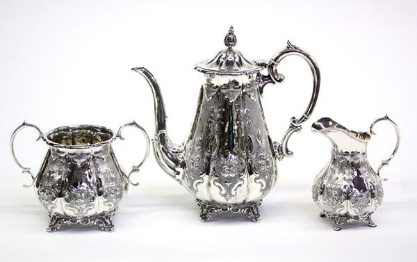 Renaissance Revival silverplate three piece service, in a Baroque taste, designed with a granulated ground having elaborate hand-chased scrolls, flowers, and stylized foliage, comprising a hot beverage pot, open sugar basin, and cream jug, 'JSR' monogram on sugar and creamer, hot beverage pot inscirbed ''U.M. Free Church Presented to Rev'd J.S. Rendell on his removal from the Scarbro' Circuit August 20, 1867''
