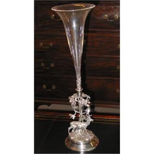 Epergne with handblown glass vase. Silverplated Base with Stag and oaktree/acorn theme. Decorative collectible. c.1920's 24ins tall.