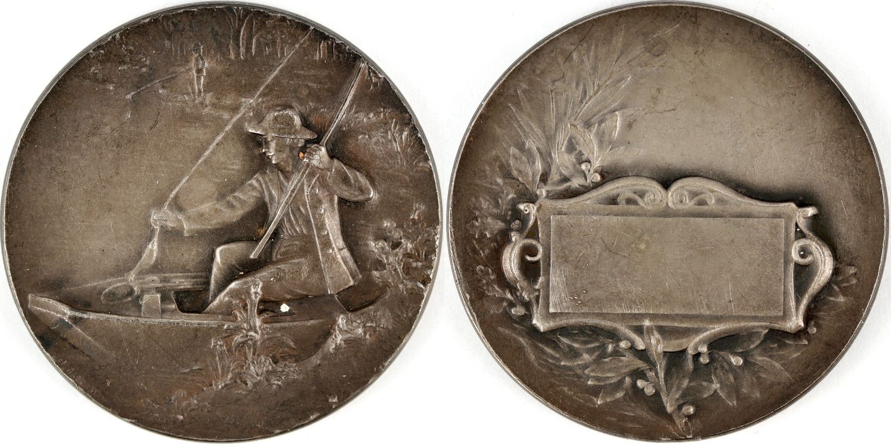 Fisherman in a canoe, landing a fish // unengraved wreath. 44 mm, white metal.