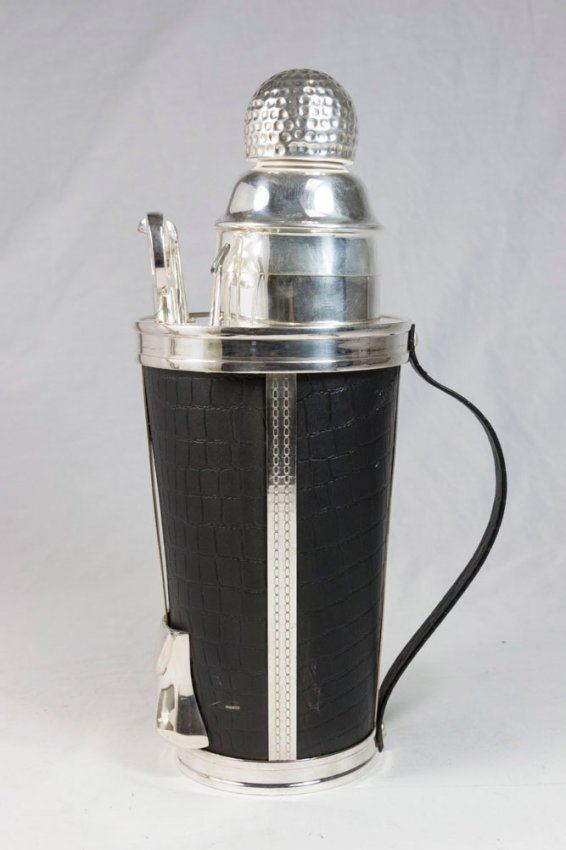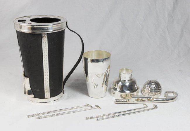Golf ball on lid. With golf club stirrers and golf club bottle opener. Approx. 13" H.
