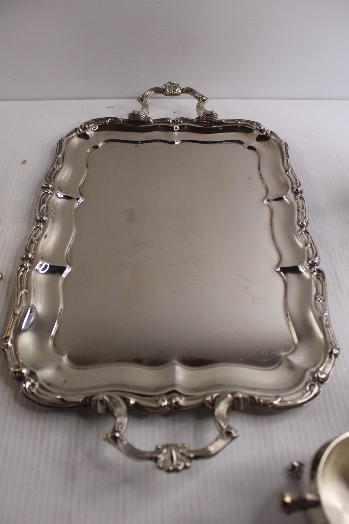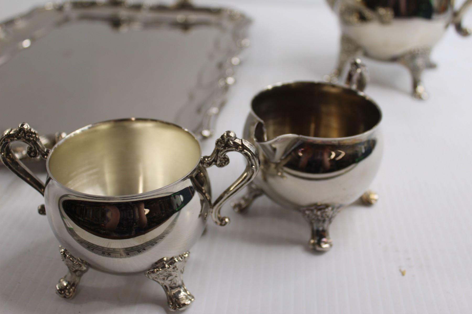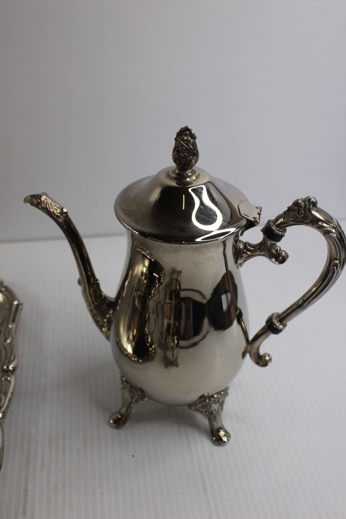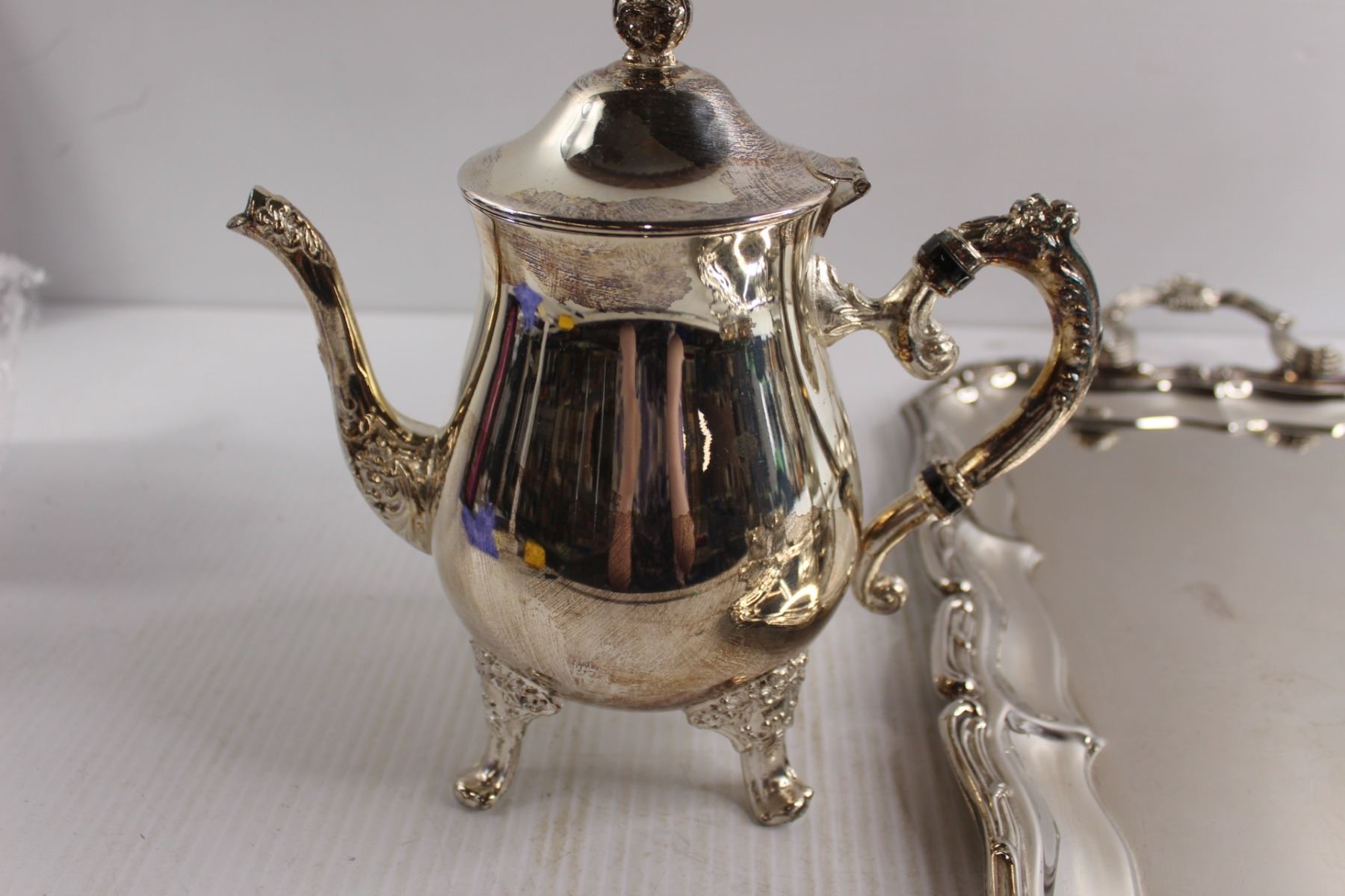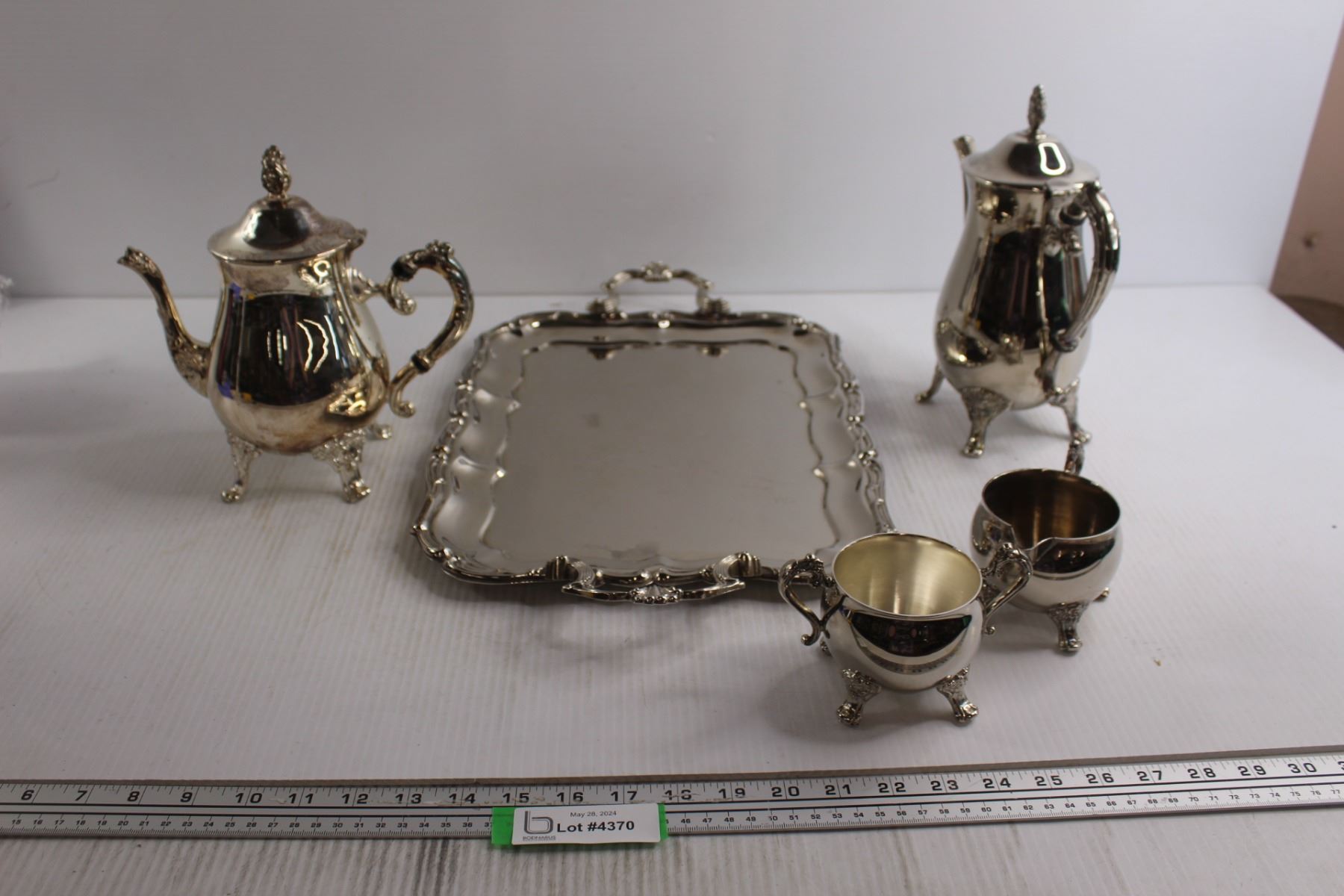 Silverplated Tray, (2) Teapots, and Cream & Sugar
