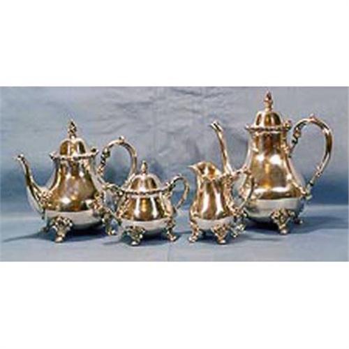 Five (5) piese silverplated coffee and tea set with matching tray in the American Rose pattern. This is a quality set with silver over copper giving it the feel and weight of sterling silver. Set includes coffee pot, tea pot, sugar, creamer and a 25" by 16" matching tray. Tray not shown in picture. Silver is in excellent condition.