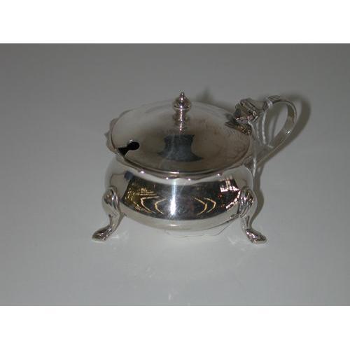Silverplated mustard pot or master salt, raised on 3 feet. Silver is in excellent condition.