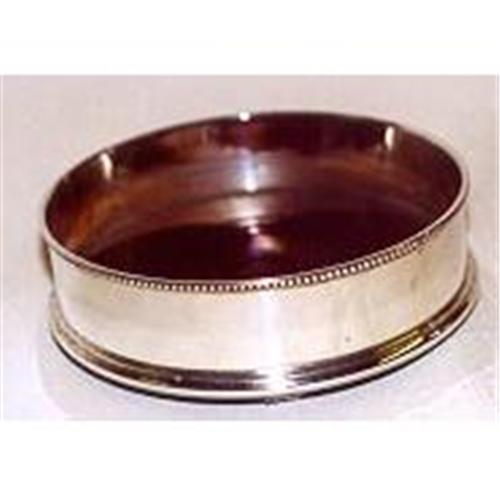 Silverplated wine bottle coaster with old wood base inside and felt on the bottom. Great silver over copper item giving the effect of feeling like a sterling silver item without the cost.