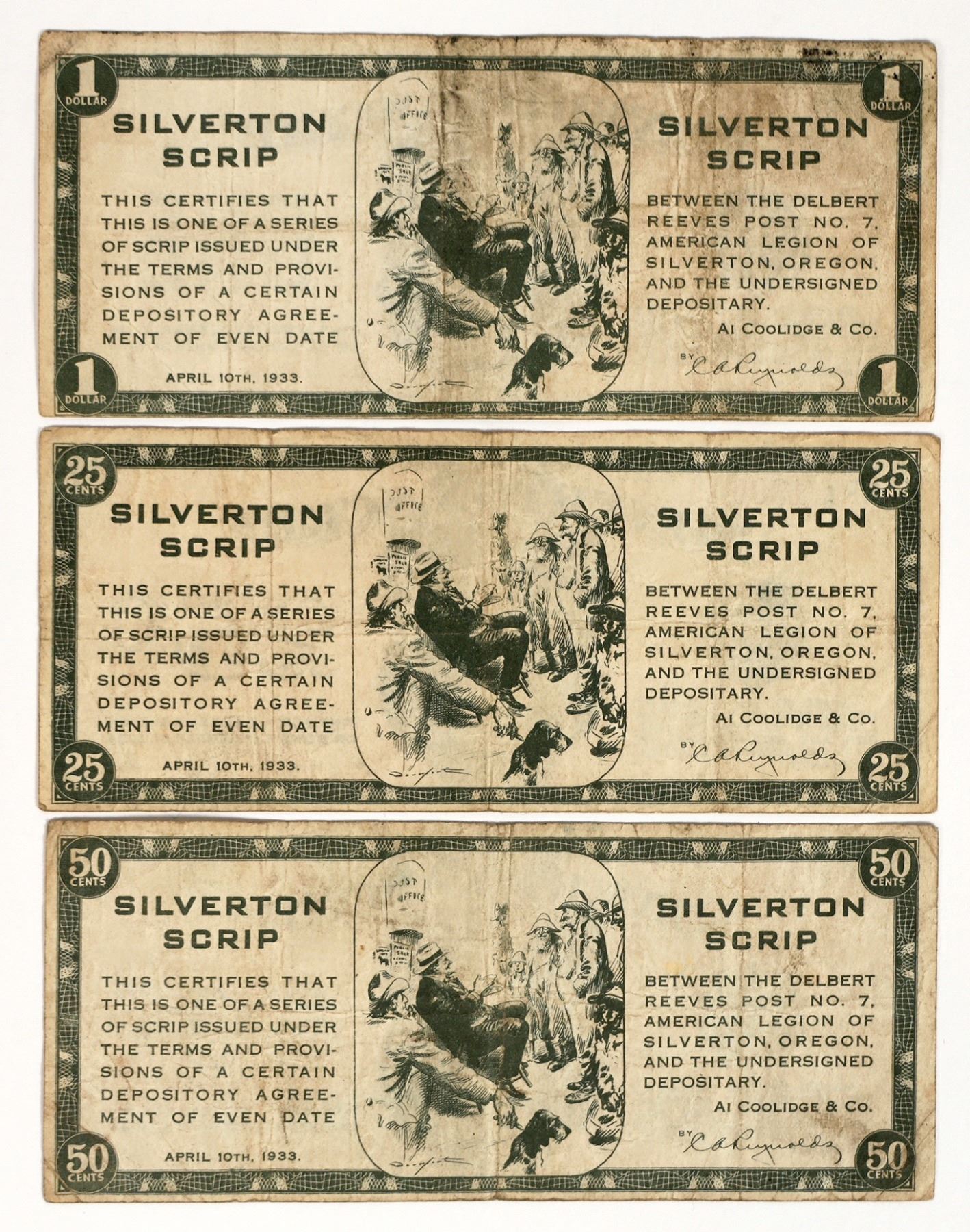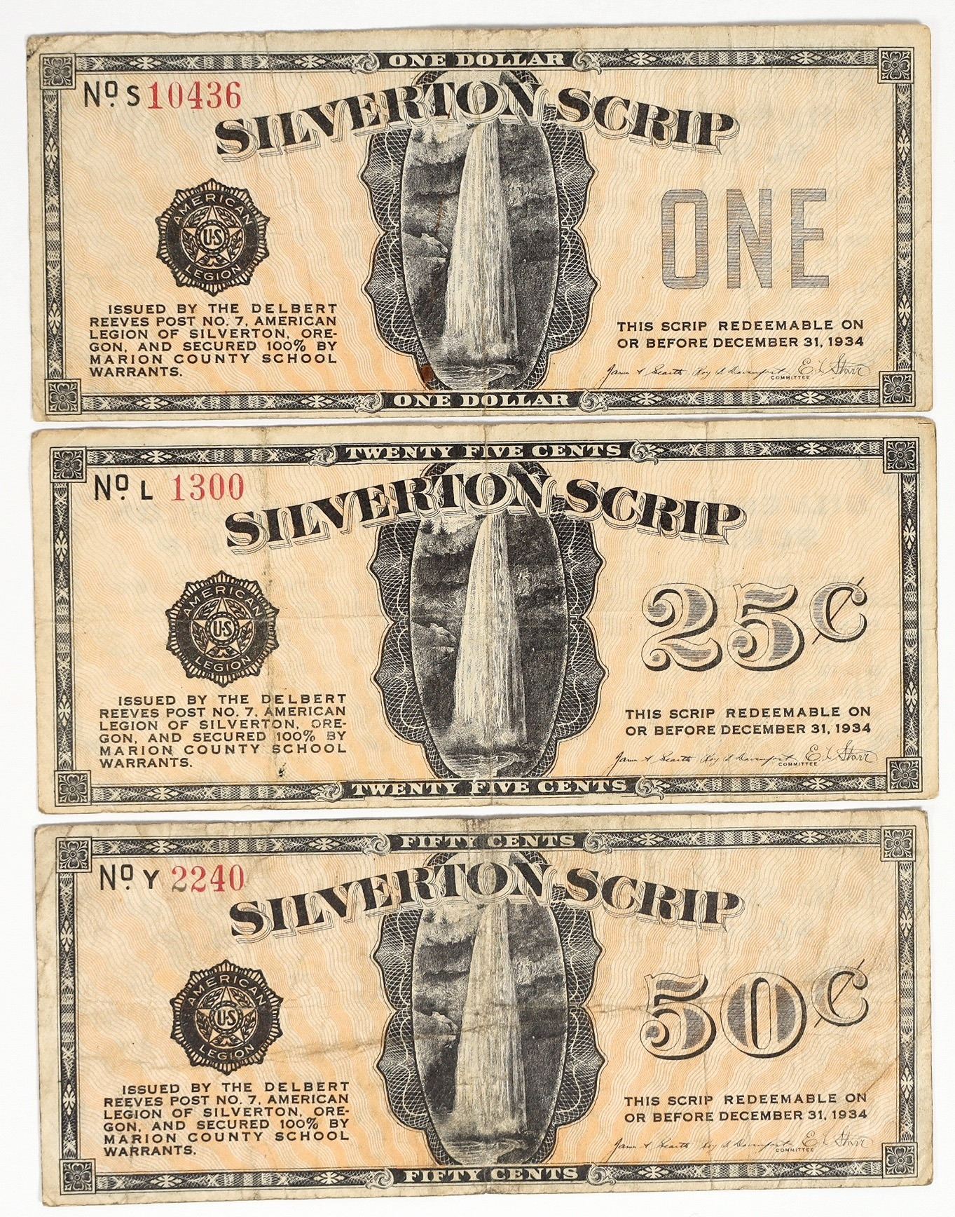 Here is a three note set: 25 cents, 50 cents and one dollar; dated 1933. Issued by the Delbert Reeves Post No. 7 American Legion of Silverton and secured 100% by Marion County School Warrants. Waterfall vignette, each note 6 x 2 1/2 inches.