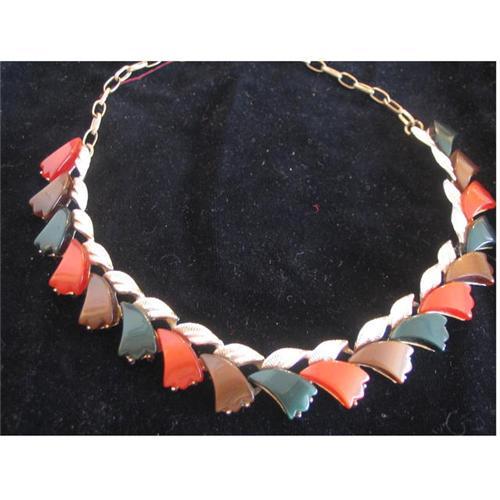 1950's thermoset silvertone and leaf decor choker in beautiful fall shades of rich orange, milk chocolate and sea foam green. 15" long