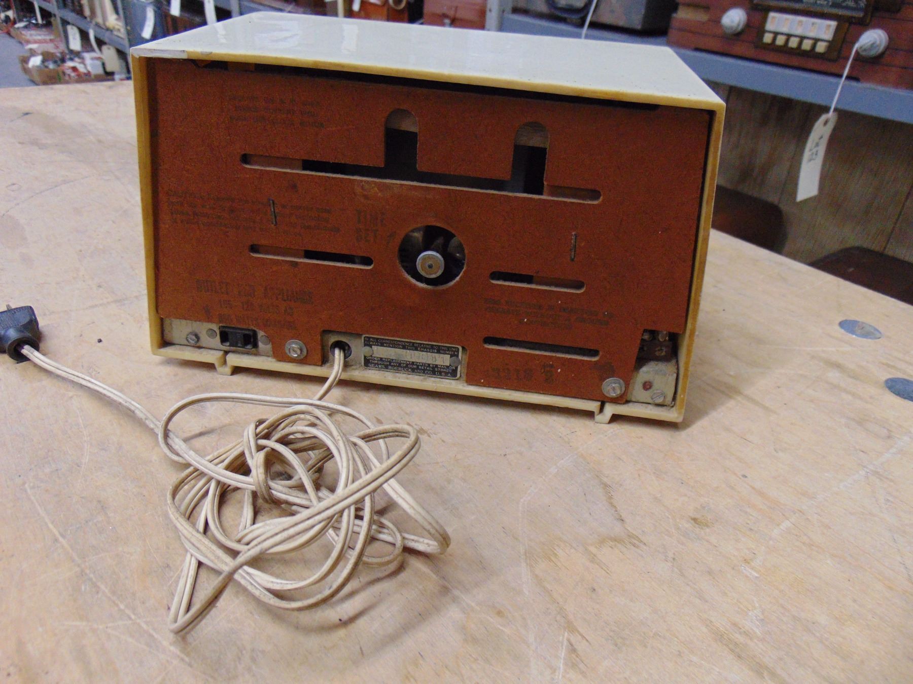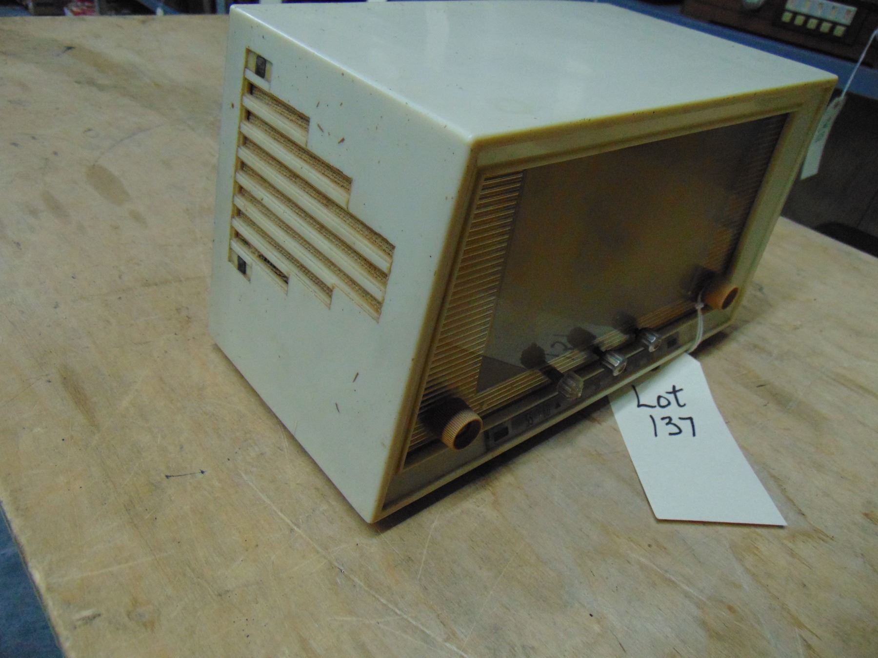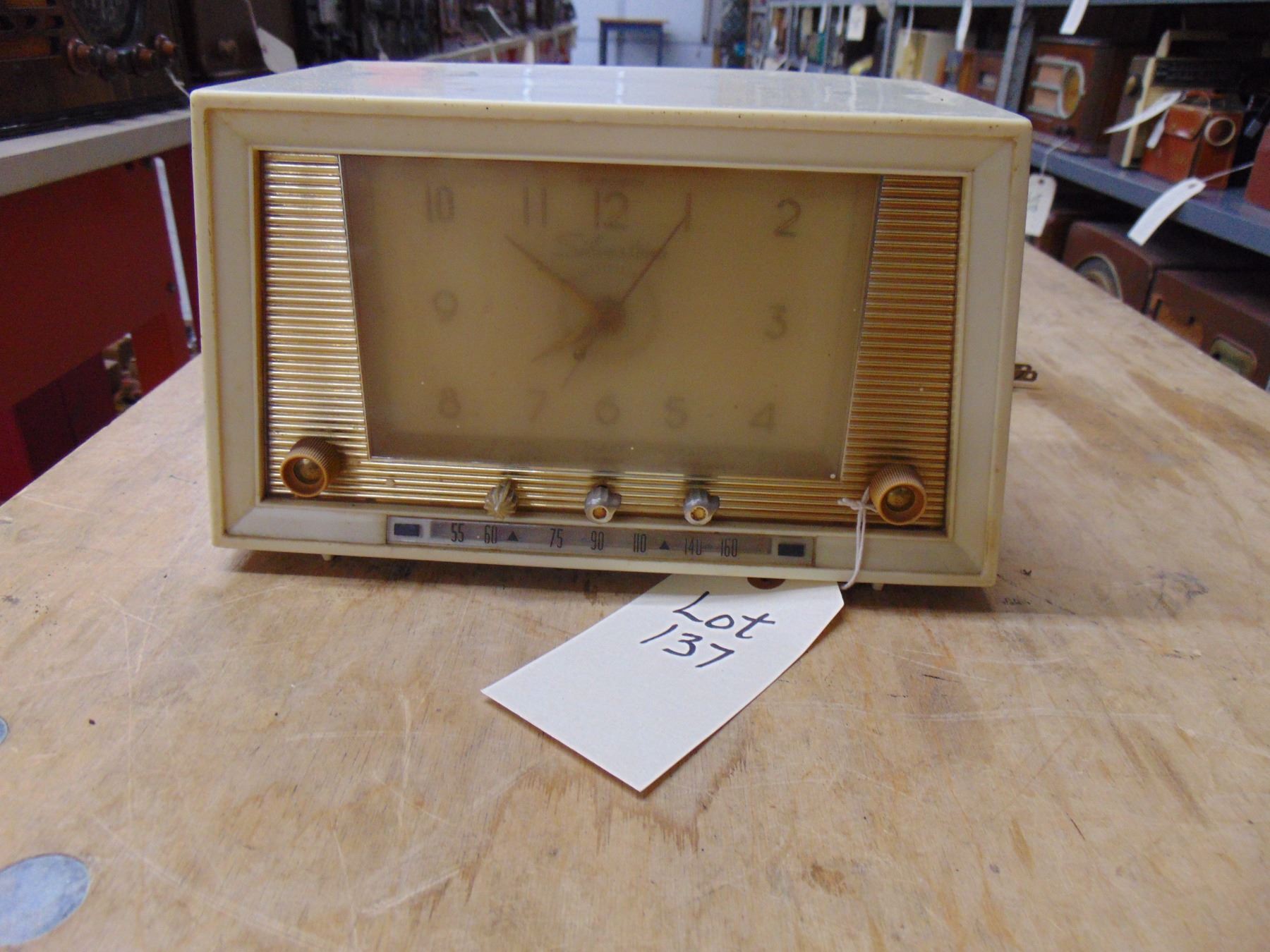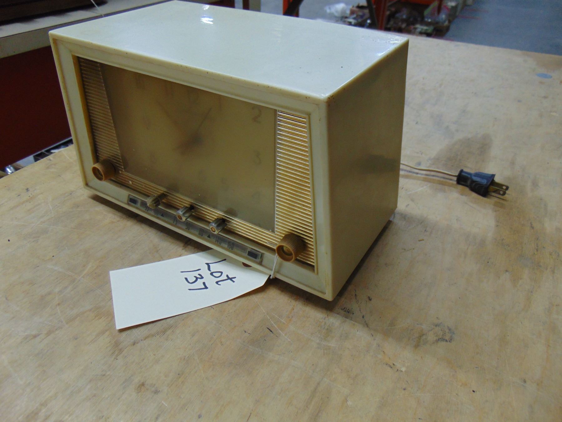 White bakelite clock radio; model 6021; hums; trapezoid shape