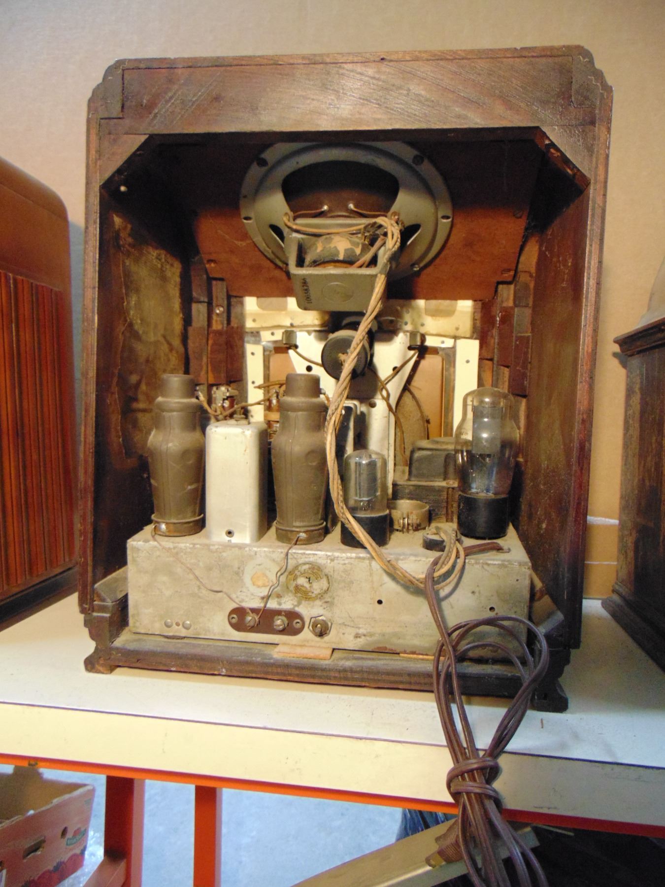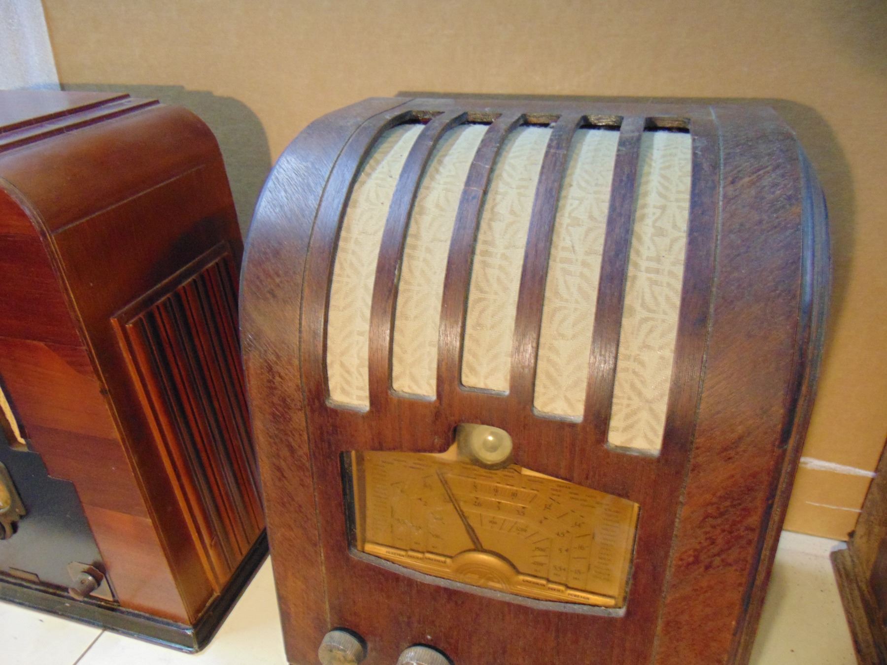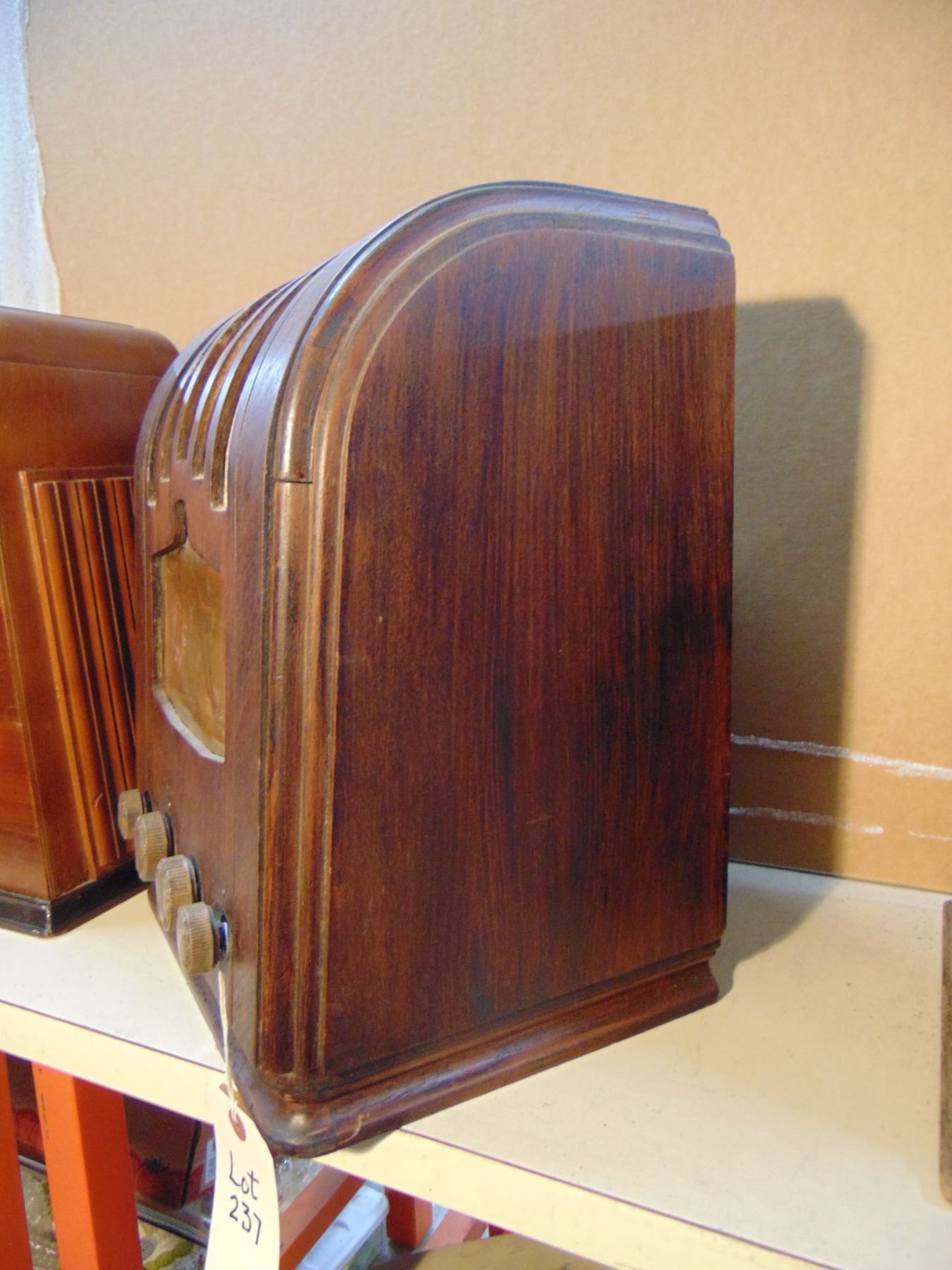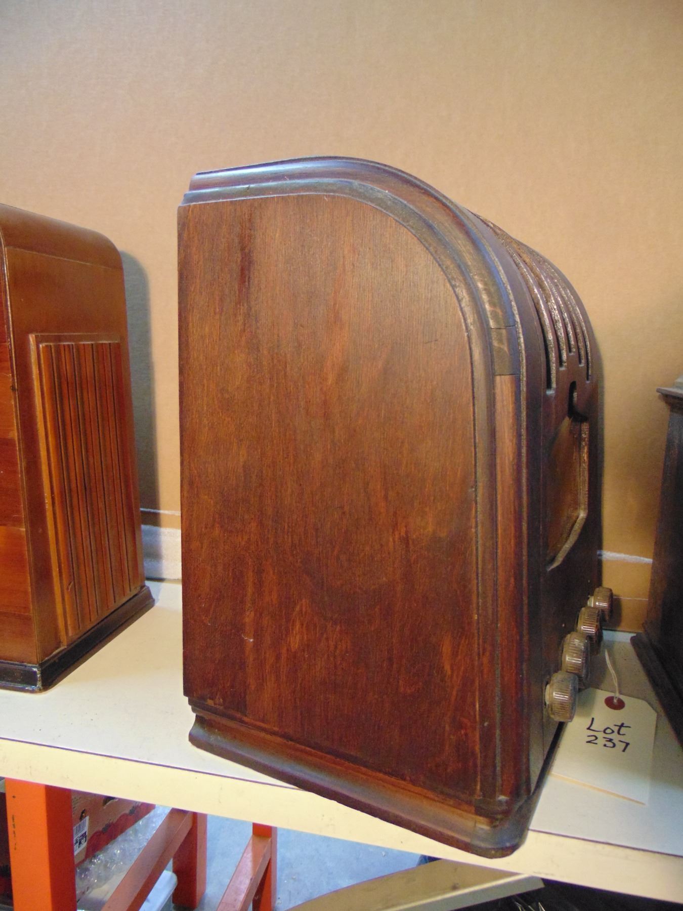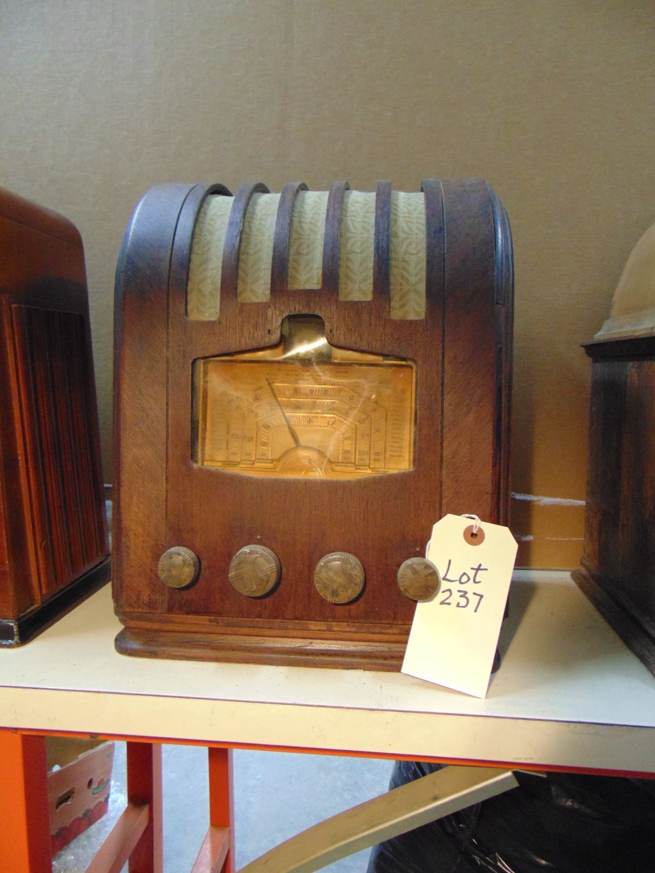 Sears Silvertone model 4663 wood tombstone table top with unusual water fall front; in nice condition. Missing escutcheon