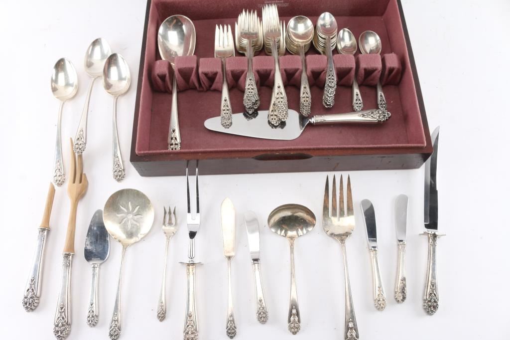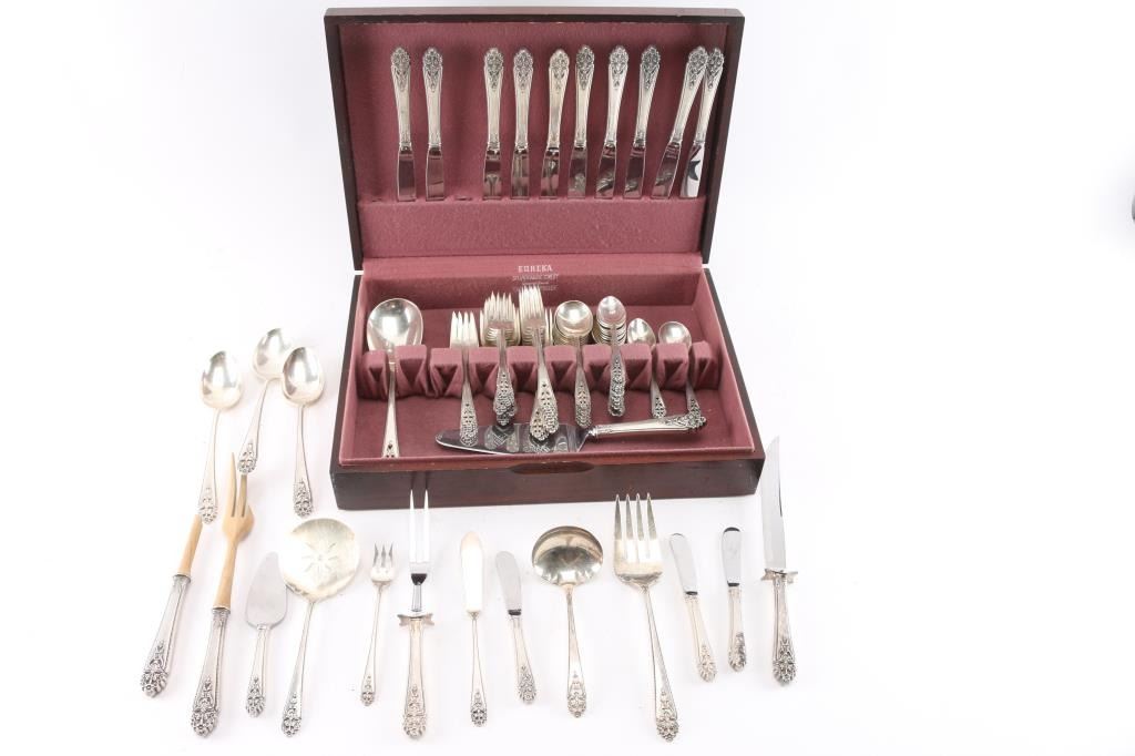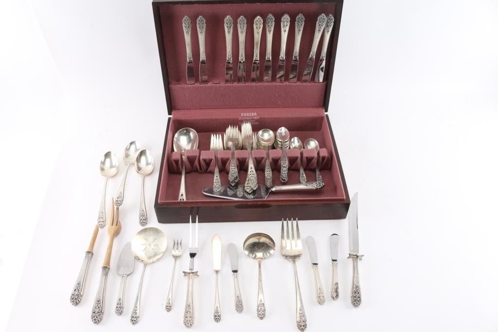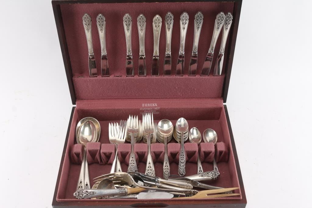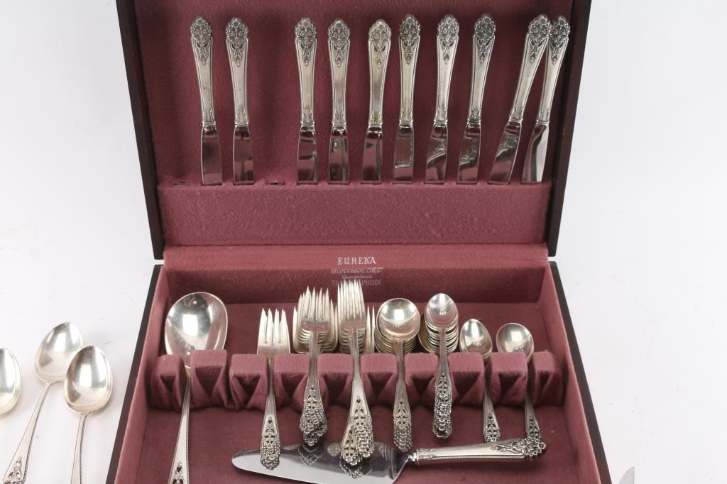 Full service for 9 with extra pieces in Eureka silverware chest. 76 pieces total. Estimated silver weight of 50oz minimum. $1200-$1500 in scrap silver value depending on spot market. Lovely pattern.