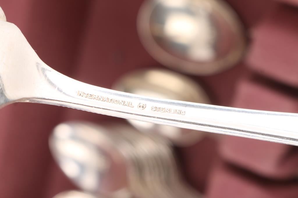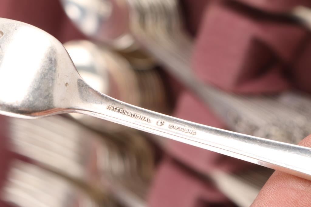 International sterling silver table service in "Lucerne Lace" pattern. Consists of: 10 knives, 10 forks, 16 salad forks, 9 soup spoons, 16 tea spoons, 1 extra large serving spoon, 3 serving spoons, 2 cake knives (1 large, 1 small), 1 ladle spoon, 1 straining spoon, 1 carving knife & fork set, 1 large salad fork, 1 odd spoon, 3 butter knives, 2 handle w/ broken wood tongs, 1 olive size serving fork.