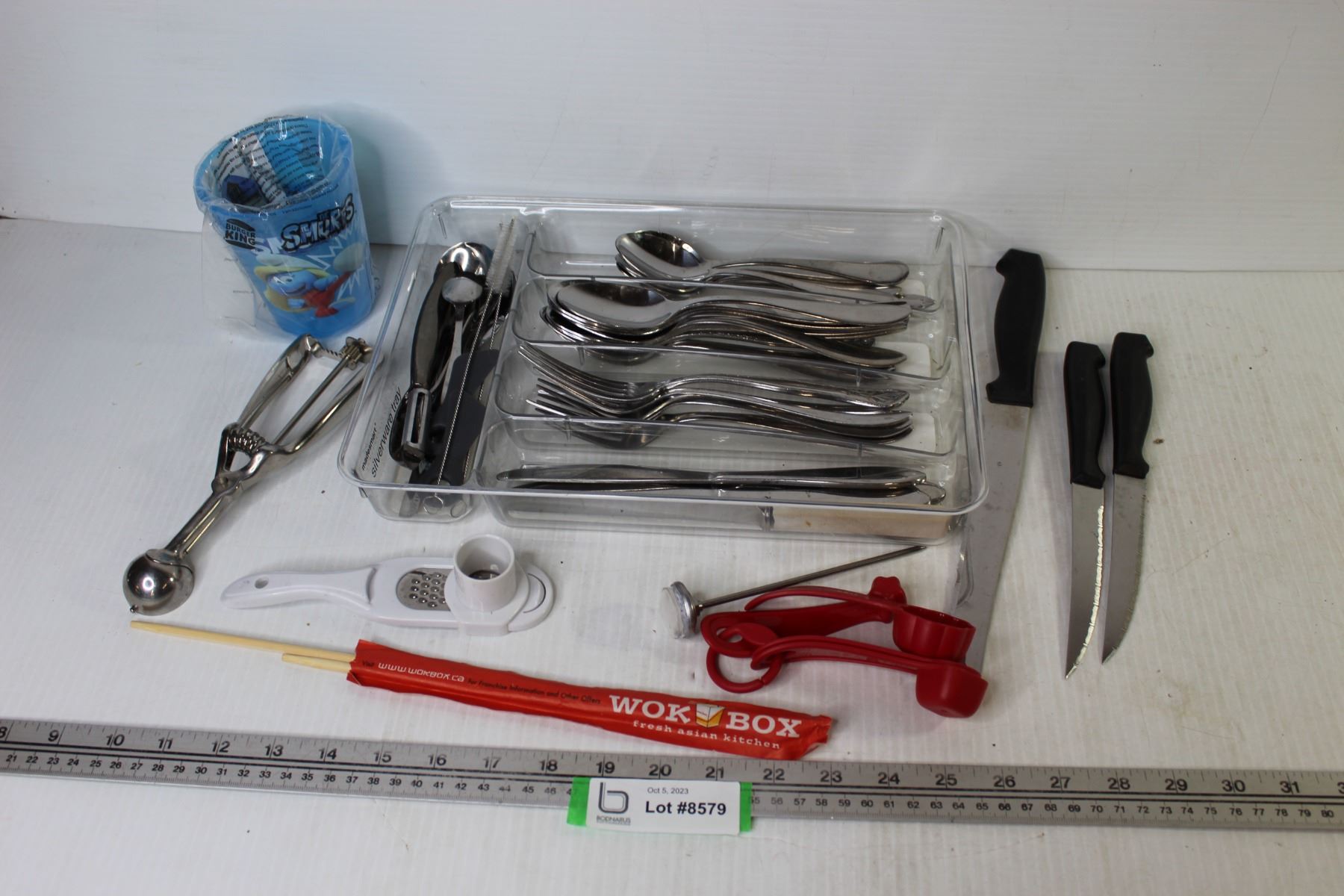 Silverware Tray - Cutlery & Knives - Plastic Smurfs Cup - Oven Thermometer - Assorted Kitchen Ware Items