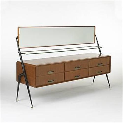 Silvio Cavatorta, attribution console cabinet Italy, c. 1955 Italian walnut, enameled brass, crystal 75"w x 20"d x 47"h This expressive cabinet features an external solid brass frame supporting a mirror and crystal shelf above six drawers. This console is similar to a documented desk by Cavatorta comissioned by Enrico Mattei and now in the Manchester City, England Art Gallery. <BR>Literature: Il Mobile Italiano degli anni '40 e '50, Guttry, ppg. 136, 137 Modern Furniture Classics: Postwar to Post-Modernism, Fiell, ppg. 64, 76