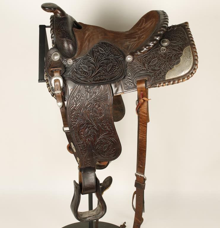 Simco tooled leather saddle with engraved silver trim and conchas, halter and body cinch; leather wrapped stirrups in overall very good to fine condition. Accompanied by an iron display stand. Est.: $500-$1,000.