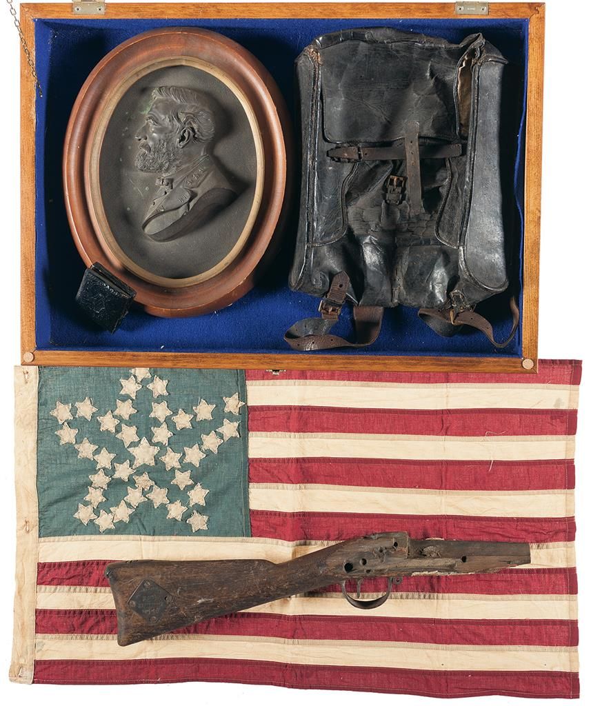With Gen. Robert E. Lee bronze plaque by Ellicott Sculp, tintype of sailor with case, leather knapsack (fair), partial gun stock with 1823 Fruiterer No. 30 tag and a 16" x 28 1/2" American flag with 34 stars arranged in a star pattern.