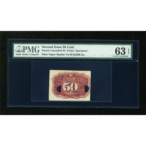 <B>Milton 2E50R.3a 50c Second Issue Specimen PMG Choice Uncirculated 63 EPQ.</B></I> This Fiber Paper specimen features half moon cancels and the back is just a bit skewed.<BR><BR><b>Shipping:</b> Coins & Currency (<a target="_blank" href="http://www.heritageauctions.com/common/shipping.php">view shipping information</a>)