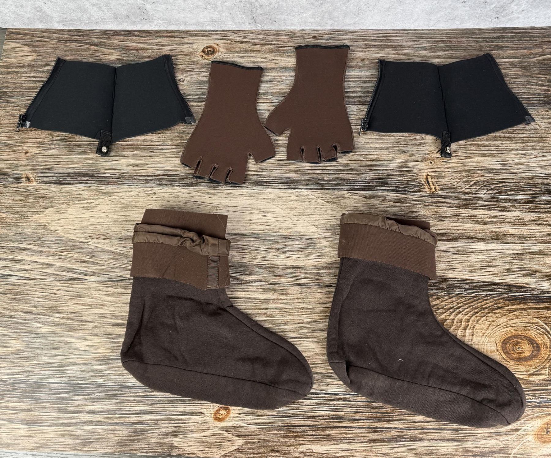 Size Long Large. Lot includes booties, gaiters, and fingerless gloves.