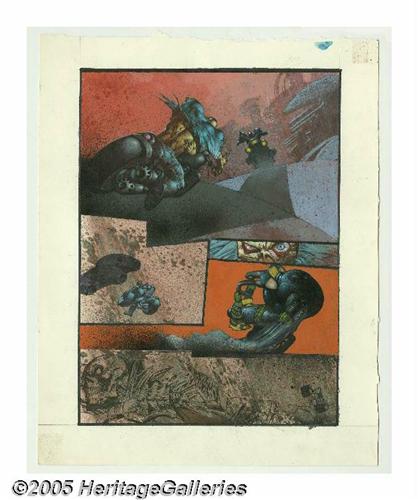 <B>Simon Bisley - Judge Dredd page Original Art (undated).</B></I> Simon Bisley has detailed this thriller in oil paint on paper, brushing in finely glazed surfaces and great splatter textures. A word to the wise -- never play "chicken" with Judge Dredd! The image area measures 10" x 13.5" and the art is in Excellent condition.