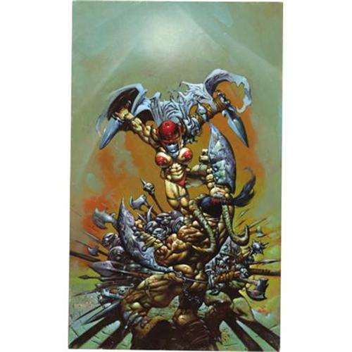 <B>Simon Bisley </B></I>- <B>Melting Pot: Book Four Cover Illustration</B></I> <B>Original Art (Kitchen Sink, 1994).</B></I> This magnificent image of Lord Tyler in battle graced the cover of Kevin Eastman and Simon Bisley’s <B>Melting Pot: Book Four</B></I>. Painted by renowned artist, Simon Bisley, this luminous illustration is filled with excellent detail and heavy impasto texturing. Rendered in acrylic on illustration board, the art has an image area of 14" x 23", and is in Excellent condition. <BR><BR><b>Shipping:</b> Flat Material, Large (<a target="_blank" href="http://www.heritageauctions.com/common/shipping.php">view shipping information</a>)