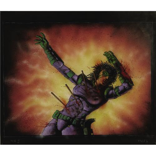 <B>Simon Bisley and Eric Talbot - Melting Pot Book One, Splash Page 5 Original Art (Kitchen Sink, 1993).</B></I> Kevin Eastman's four-part series began with the death of this unknown space explorer, whose battle-damaged starfighter crash landed on an unfamiliar planet, and the violence escalated from there. Eric Talbot put down the initial design, which was "finished off" by Simon Bisley, who unleashes a flurry of sprays and splatters, adding a veneer of grit to this dramatic moment. The image area is 18" x 23.5", and the art is in Excellent condition.