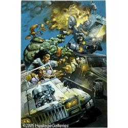 <B>Simon Bisley and Kevin Eastman - Bodycount #2 Cover Original Art (Image, 1996).</B></I> It's hot rods, hot babes, hot lead, and hot action as Raphael, Casey Jones, and Midnight hose down Johnny Woo Woo and his henchmen with a hail of heavy metal slugs! Bing, bang, boom! This acrylic on paper painting is finely detailed and augmented with all kinds of gnarly textures by a true master of splatter, the irrepressible Simon Bisley. The art is in Excellent condition and the image area measures 10" x 15". This is torrid Teenage Mutant Turtles action at its baddest, so bid accordingly!