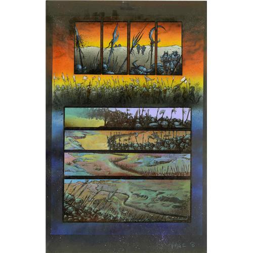 <B>Simon Bisley and Kevin Eastman - Melting Pot, Book One, page 8 Original Art (Kitchen Sink, 1994).</B></I> Two killers join an army of blood-thirsty soldiers making their yearly journey to the fortress of Shantarr, in this eighth page of the first issue of <B>Melting Pot</B></I>, Kevin Eastman and Simon Bisley's epic four-issue series. Kevin Eastman pencils, and Simon Bisley paints, this formidable multi-paneled page. The art has an image area of 13.75" x 21.5" and is in Excellent condition.