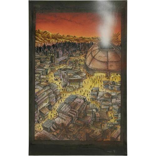 <B>Simon Bisley and Kevin Eastman - Melting Pot, Book One, Splash Page 9 Original Art (Kitchen Sink, 1994).</B></I> The border town of Juudas gets the Simon Bisley touch, in this remarkable, panoramic rendering. Created, written, and penciled by Kevin Eastman, the art was given a final painted polish by one of the most prolific painters in the "Biz"-ness, Simon Bisley! The art has an image area of 13.5" x 21" and is in Excellent condition.