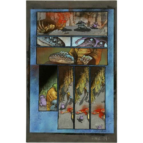 <B>Simon Bisley and Kevin Eastman - Melting Pot, Book One, page 14 Original Art (Kitchen Sink, 1994).</B></I> More mayhem and malevolence from the minds of Kevin Eastman and Simon Bisley! In the mean streets of Juudas, the peace-seeking Odin stops his bodyguard, Zeek, from killing yet another creature, in this devastating delineation. The Biz lavishes his paint over Eastman's pencils to produce this deep, rich rendering. With an image area of 13.75" x 21.5", this art is in Excellent condition.