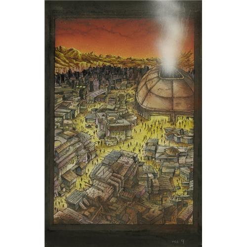 <B>Simon Bisley and Kevin Eastman - Melting Pot, Book One, Splash Page 9 Original Art (Kitchen Sink, 1994).</B></I> The border town of Juudas gets the Simon Bisley touch, in this remarkable, panoramic rendering. Created, written, and penciled by Kevin Eastman, the art was given a final painted polish by one of the most prolific painters in the "Biz"-ness, Simon Bisley! The art has an image area of 13.5" x 21" and is in Excellent condition.
