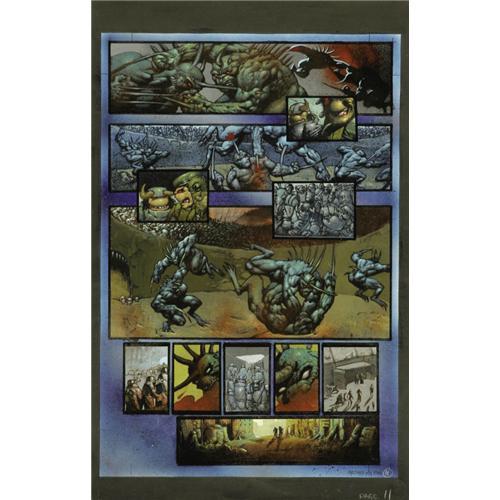 <B>Simon Bisley and Kevin Eastman - Melting Pot, Book One, page 11 Original Art (Kitchen Sink, 1994).</B></I> The mighty Gorr loses his battle in the arena at Juudas, leaving two soldiers broke, in this fatal page by Kevin Eastman and Simon Bisley. Eastman pencils, and Bisley paints this bloody page from the first book of the <B>Melting Pot</B></I> series. The art has an image area of 13.5" x 21" and is in Excellent condition.