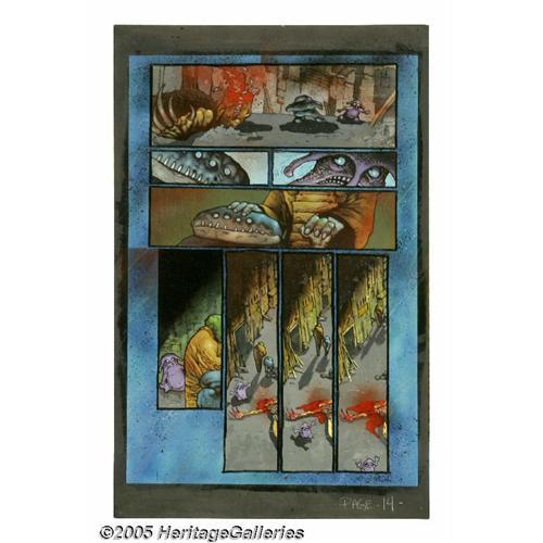 <B>Simon Bisley and Kevin Eastman - Melting Pot, Book One, page 14 Original Art (Kitchen Sink, 1994).</B></I> More mayhem and malevolence from the minds of Kevin Eastman and Simon Bisley! In the mean streets of Juudas, the peace-seeking Odin stops his bodyguard, Zeek, from killing yet another creature, in this devastating delineation. The Biz lavishes his paint over Eastman's pencils to produce this deep, rich rendering. With an image area of 13.75"" x 21.5"", this art is in Excellent condition. <BR><BR><B>Important notice:</B> Heritage usually auctions material at the rate of 200-250 lots per hour. On some occasions eBay Live bid software or the Internet may not be able to keep up with the pace of the auction. We recommend placing a realistic absentee bid now as insurance to avoid disappointment. Occasionally the auctioneer may eliminate or reject an eBay Live bid, and the auctioneer may also reopen a lot after the close of the eBay live bidding (usually because we missed an audience bid), and may reject your bid even if it shows you as the winning bidder. By bidding via eBay Live, you agree that Heritage may award the lot to another bidder at its sole discretion under the circumstances described above or any other reasonable circumstances. Since eBay bids are not shown to us until we open the lot on the floor, we treat those bids just like floor bids. In most cases the floor responds before the eBay bid is presented to us, due to Internet lag time, so for consistency we have made it a policy that floor bids are always considered first over tie eBay live bids. Also please note that all Heritage lots purchased through eBay Live carry a 20% Buyer's Premium. Please make sure you read the Terms and Conditions before you bid. This lot is being auctioned in conjunction with a live floor auction by Heritage Galleries & Auctioneers. All final auction and invoice information will be supplied by Heritage Galleries & Auctioneers, and all other information should be considered
