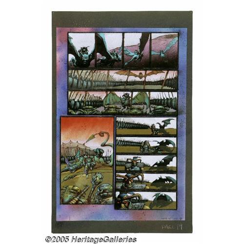 <B>Simon Bisley and Kevin Eastman - Melting Pot, Book One, page 19 Original Art (Kitchen Sink, 1994).</B></I> Riding a horrid winged monstrosity, the malevolent Lord Tyler returns to his troops, who stand ready for battle. Simon Bisley paints over Kevin Eastman's pencils on this page from the four issue series. Bisley's tight ink and acrylic wash renderings nicely highlight the panels. The art has an image area of 14"" x 21.5"" and is in Excellent condition. <BR><BR><B>Important notice:</B> Heritage usually auctions material at the rate of 200-250 lots per hour. On some occasions eBay Live bid software or the Internet may not be able to keep up with the pace of the auction. We recommend placing a realistic absentee bid now as insurance to avoid disappointment. Occasionally the auctioneer may eliminate or reject an eBay Live bid, and the auctioneer may also reopen a lot after the close of the eBay live bidding (usually because we missed an audience bid), and may reject your bid even if it shows you as the winning bidder. By bidding via eBay Live, you agree that Heritage may award the lot to another bidder at its sole discretion under the circumstances described above or any other reasonable circumstances. Since eBay bids are not shown to us until we open the lot on the floor, we treat those bids just like floor bids. In most cases the floor responds before the eBay bid is presented to us, due to Internet lag time, so for consistency we have made it a policy that floor bids are always considered first over tie eBay live bids. Also please note that all Heritage lots purchased through eBay Live carry a 20% Buyer's Premium. Please make sure you read the Terms and Conditions before you bid. This lot is being auctioned in conjunction with a live floor auction by Heritage Galleries & Auctioneers. All final auction and invoice information will be supplied by Heritage Galleries & Auctioneers, and all other information should be considered preliminary. Lot:4056 <BR><BR><B>Winn